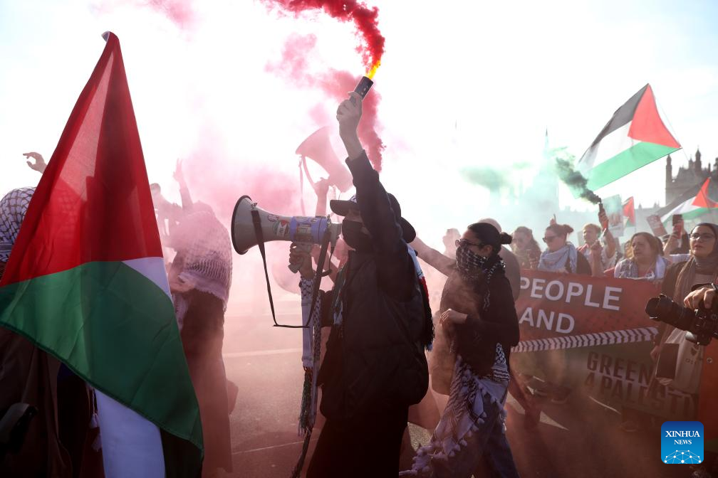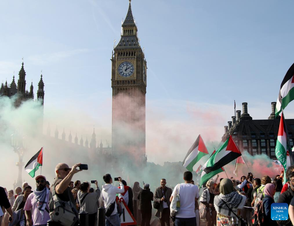 Protesters in support of Palestine are pictured in London, Britain, Oct. 11, 2025. Tens of thousands people took to the street here on Saturday in support of Palestine. (Xinhua/Li Ying)
