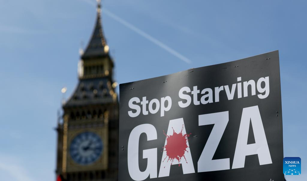 A placard held by a protester is pictured near the Big Ben in London, Britain, Oct. 11, 2025. Tens of thousands of people took to the street here on Saturday in support of Palestine. (Xinhua/Li Ying)