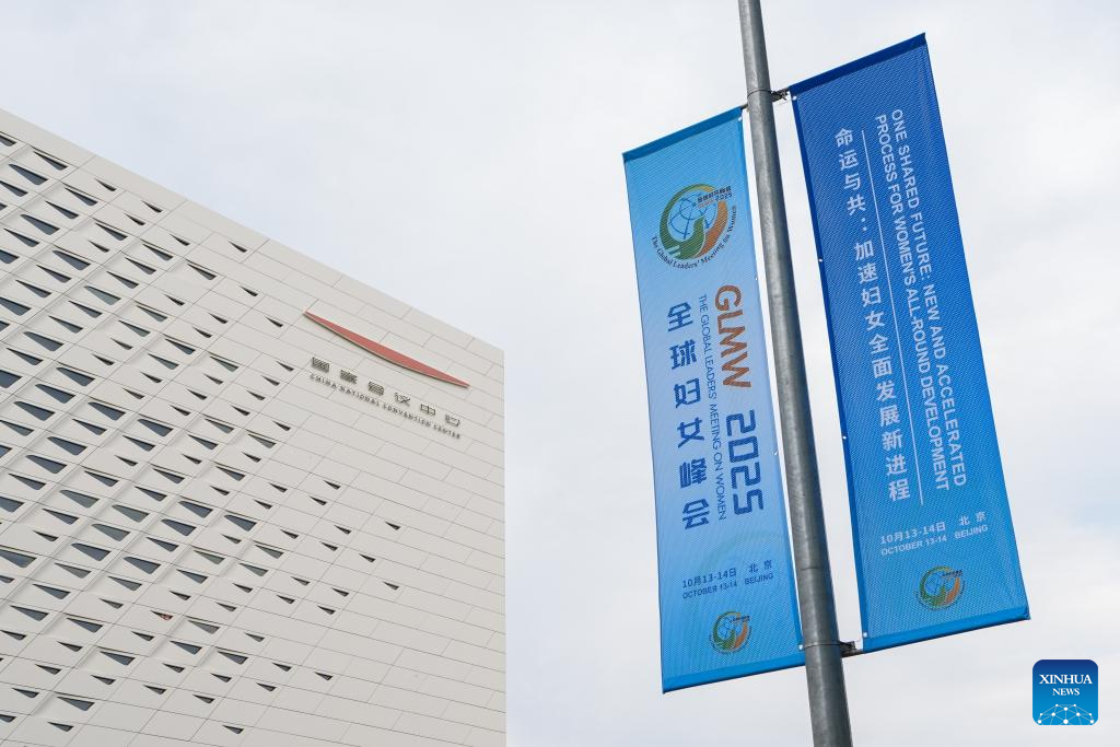 Street banners for the Global Leaders' Meeting on Women are pictured in Beijing, capital of China, on Oct. 12, 2025. The Global Leaders' Meeting on Women will be held in Beijing from Oct. 13 to 14. (Xinhua/Yan Linyun)