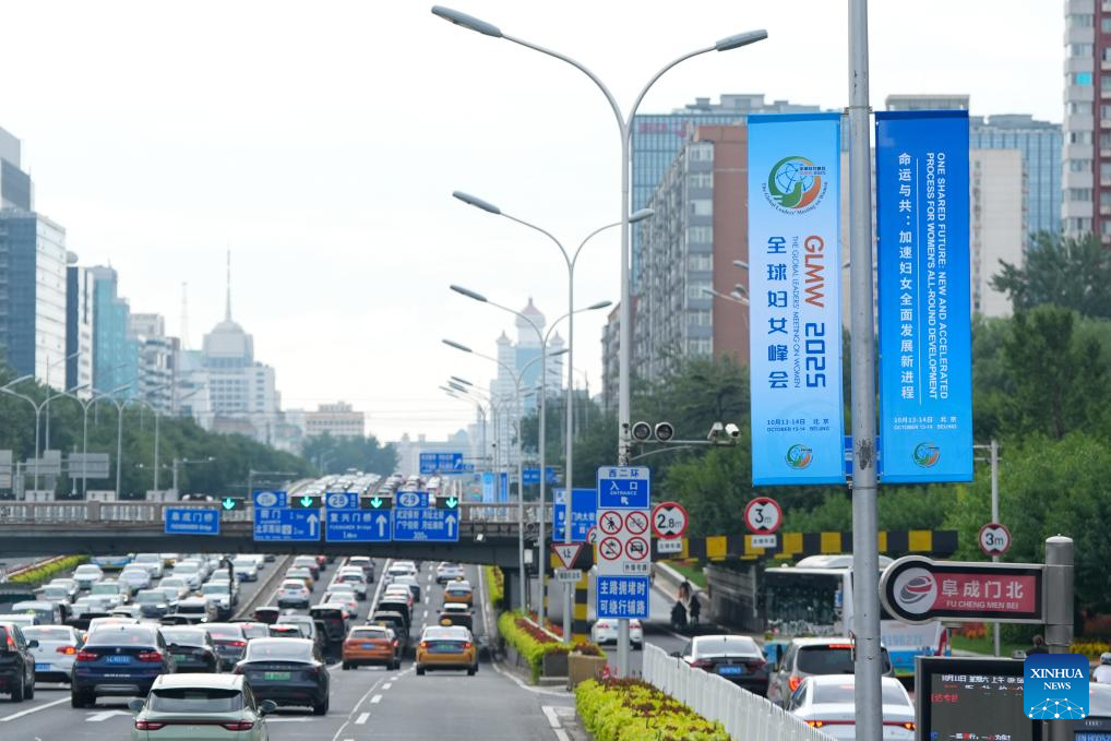 Street banners for the Global Leaders' Meeting on Women are pictured in Beijing, capital of China, on Oct. 11, 2025. The Global Leaders' Meeting on Women will be held in Beijing from Oct. 13 to 14. (Xinhua/Ju Huanzong)