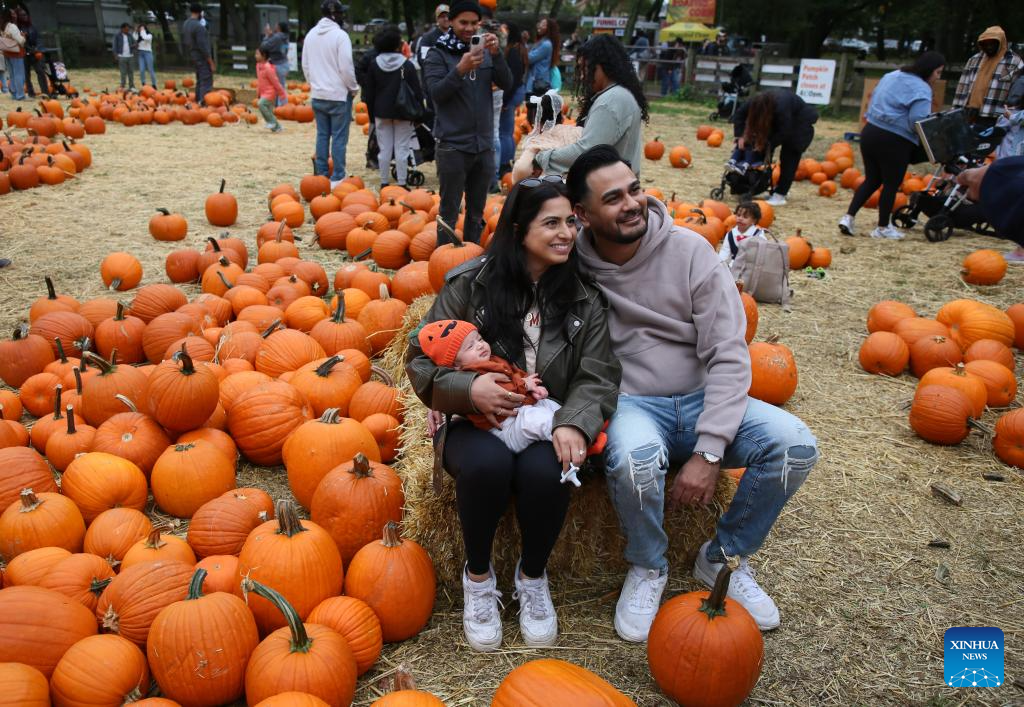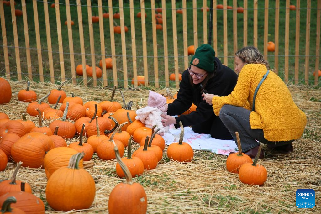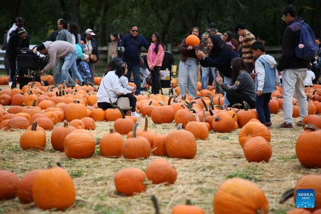 People visit a pumpkin patch at Queens County Farm Museum in New York, the United States, on Oct. 11, 2025. The pumpkin patch hosted by Queens County Farm Museum attracts many visitors to celebrate autumn and prepare for upcoming Halloween. (Xinhua/Zhang Fengguo)