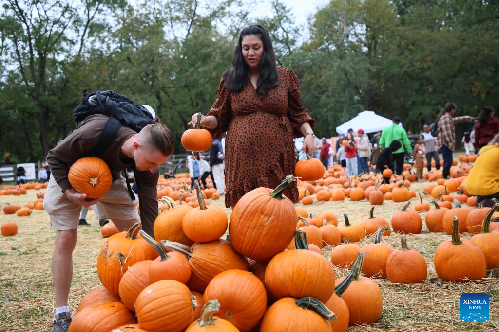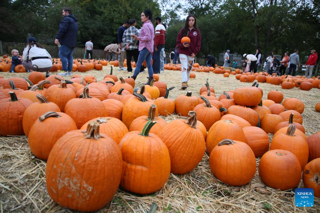 People select pumpkins during a pumpkin patch at Queens County Farm Museum in New York, the United States, on Oct. 11, 2025. The pumpkin patch hosted by Queens County Farm Museum attracts many visitors to celebrate autumn and prepare for upcoming Halloween. (Xinhua/Zhang Fengguo)