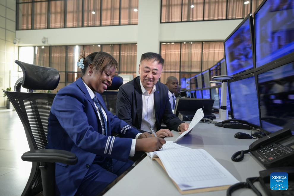 Damaris Mutinda and Feng Xudong, head of the transportation and dispatch department in Africa Star Railway Operation Company, the operator of the China-built Mombasa-Nairobi Standard Gauge Railway (SGR), check the work log at the Kenya Railways Dispatch Center of the Mombasa-Nairobi SGR in Nairobi, Kenya, Sept. 30, 2025. (Xinhua/Yang Guang)