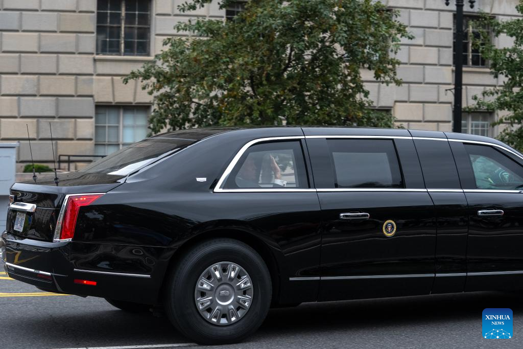 U.S. President Donald Trump waves from his vehicle as he departs the White House for the Middle East, in Washington, D.C., the United States, Oct. 12, 2025. Trump is expected to arrive in Israel on Monday morning. During his brief visit, he will address the Israeli parliament and meet Prime Minister Benjamin Netanyahu and hostage families.