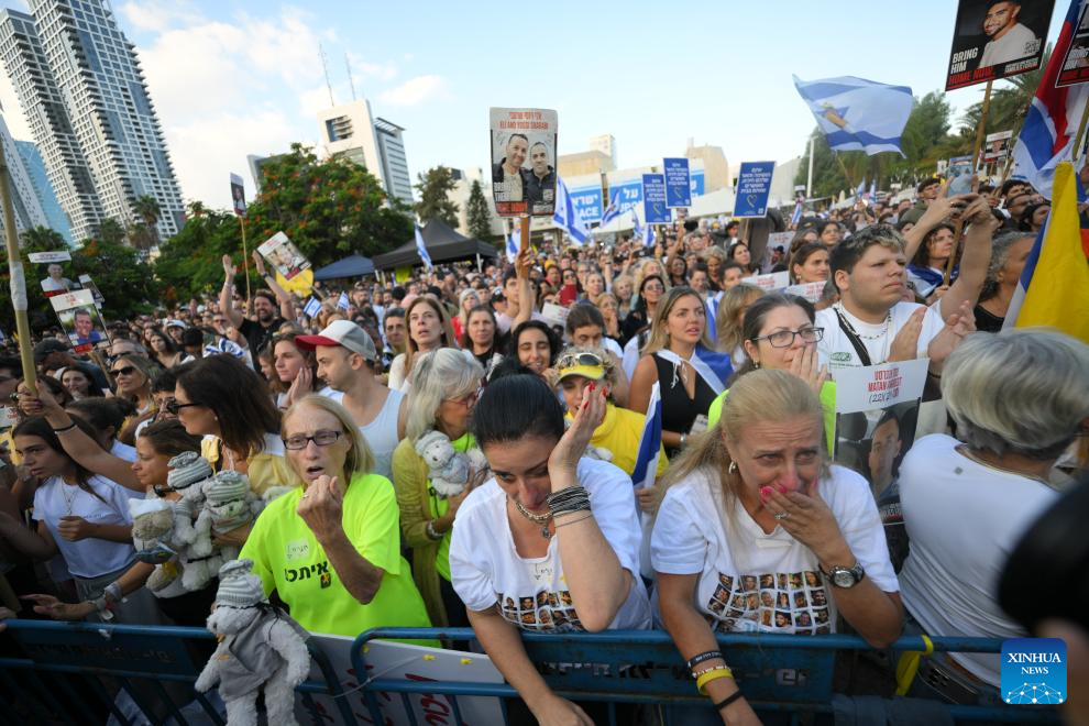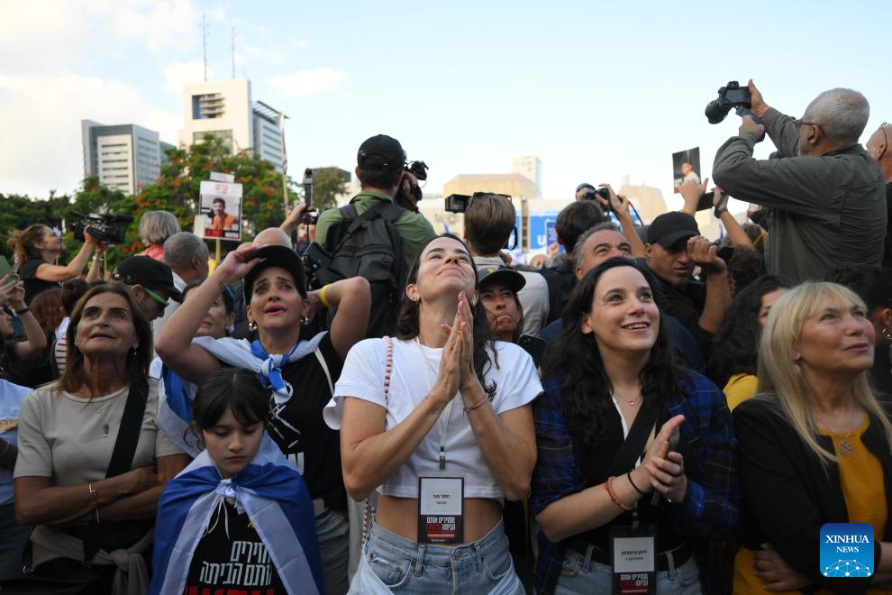 People watch live broadcasting of the release of hostages on a square in Tel Aviv, Israel, on Oct. 13, 2025. Hamas on Monday morning began releasing the first batch of hostages who had been held in Gaza for more than two years, as part of a major prisoner swap under a newly implemented ceasefire, Israel's state-owned Kan TV reported. (Photo by Jamal Awad/Xinhua)