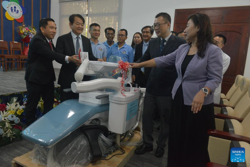 Cambodian and Chinese officials attend a hand-over ceremony of dental treatment chairs in Phnom Penh, Cambodia, Oct. 13, 2025. (Photo by Phearum/Xinhua)