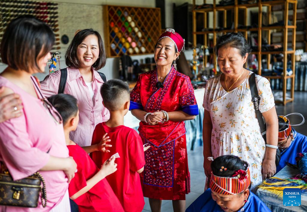 Long Luying (2nd R) talks with tourists at the workshop in Shibing County of Qiandongnan Miao and Dong Autonomous Prefecture, southwest China's Guizhou Province, Oct. 10, 2025.