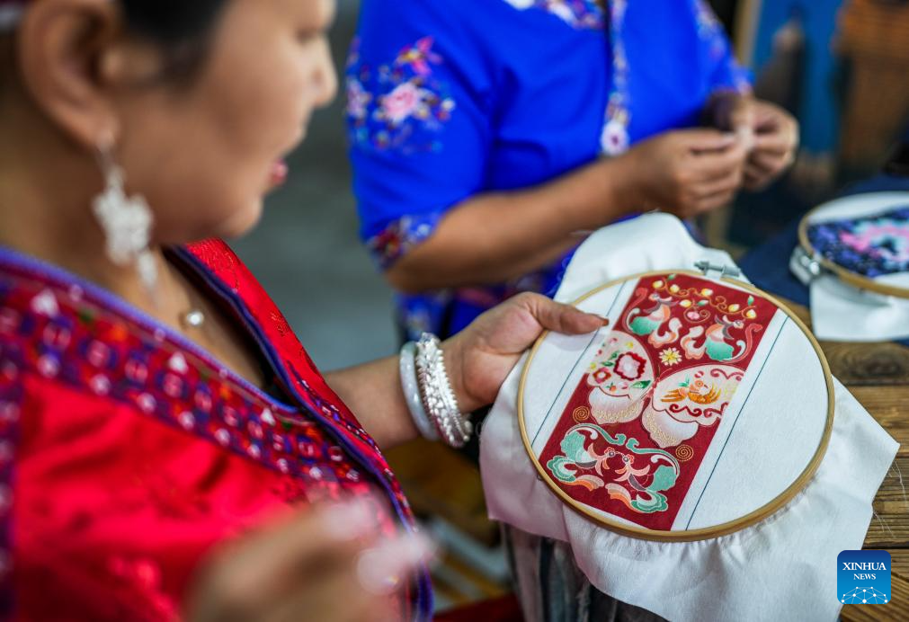 Long Luying makes embroidery at the workshop in Shibing County of Qiandongnan Miao and Dong Autonomous Prefecture, southwest China's Guizhou Province, Oct. 10, 2025.