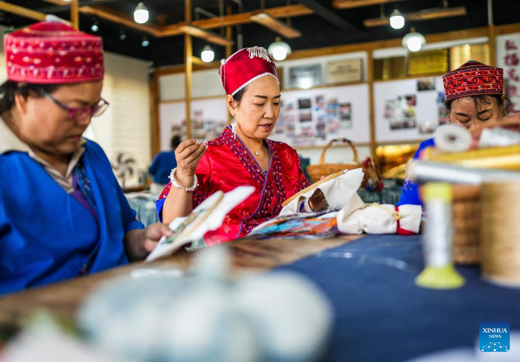 Long Luying (C) makes embroidery at the workshop in Shibing County of Qiandongnan Miao and Dong Autonomous Prefecture, southwest China's Guizhou Province, Oct. 10, 2025.