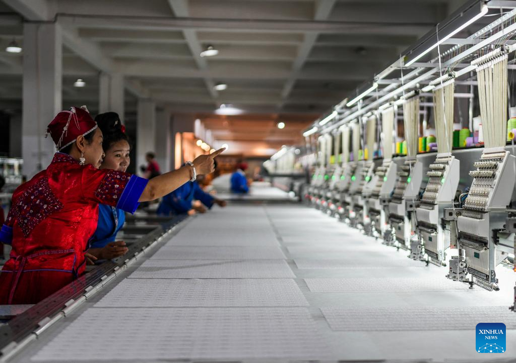 Long Luying guides workers on how to operate the equipment at an intelligent embroidery workshop in Shibing County of Qiandongnan Miao and Dong Autonomous Prefecture, southwest China's Guizhou Province, Oct. 10, 2025.