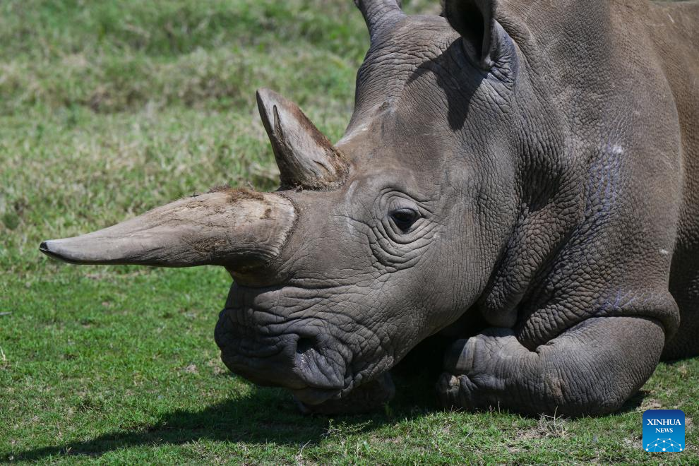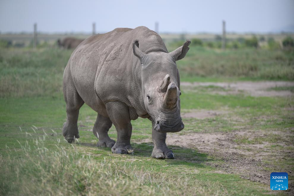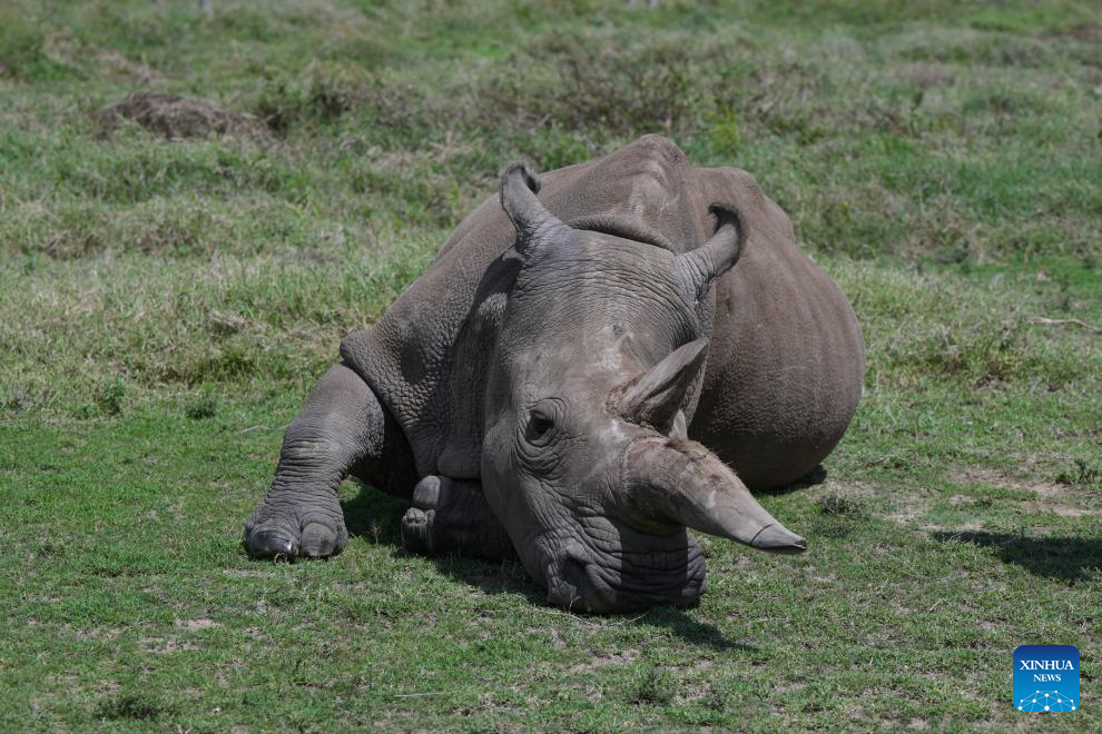 This photo taken on Oct. 7, 2025 shows the female northern white rhino "Najin" at the Ol Pejeta Conservancy in Laikipia County, Kenya. "Najin" and "Fatu" are the last two living northern white rhinos on earth. They are now housed at Ol Pejeta Conservancy in Laikipia County, Kenya. (Xinhua/Yang Guang)