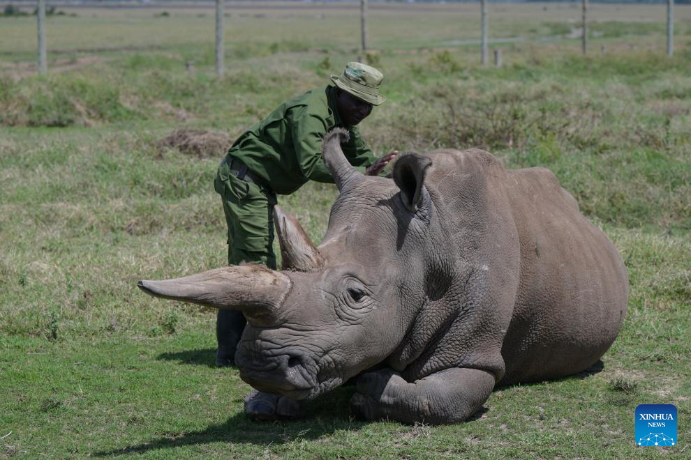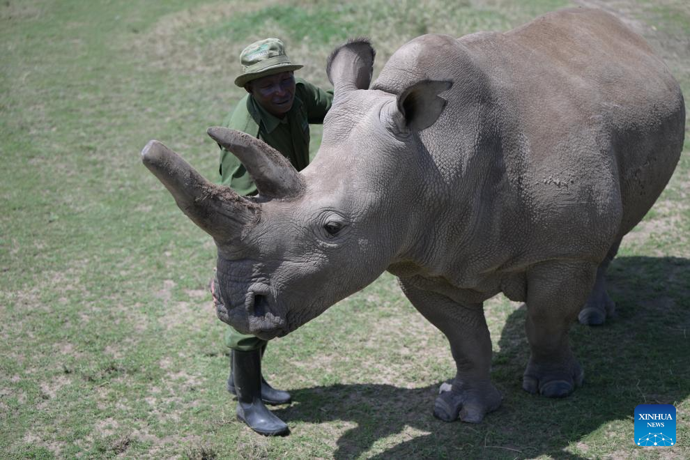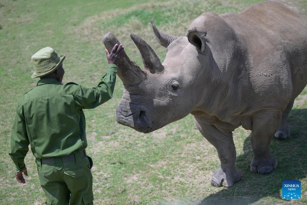 A staff member interacts with the female northern white rhino "Najin" at the Ol Pejeta Conservancy in Laikipia County, Kenya, Oct. 7, 2025. "Najin" and "Fatu" are the last two living northern white rhinos on earth. They are now housed at Ol Pejeta Conservancy in Laikipia County, Kenya. (Xinhua/Yang Guang)