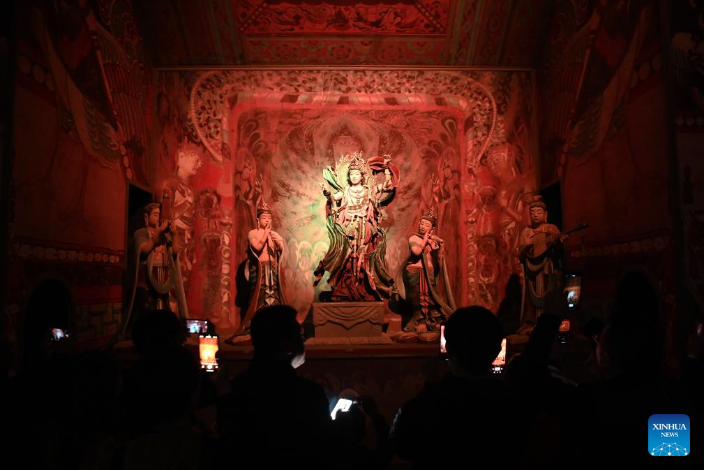 An immersive drama titled "Ancient Sound of Dunhuang" is staged for guests attending the Global Mayors Dialogue -- Dunhuang event, in Dunhuang, northwest China's Gansu Province, Oct. 12, 2025. (Xinhua/Fan Peishen)