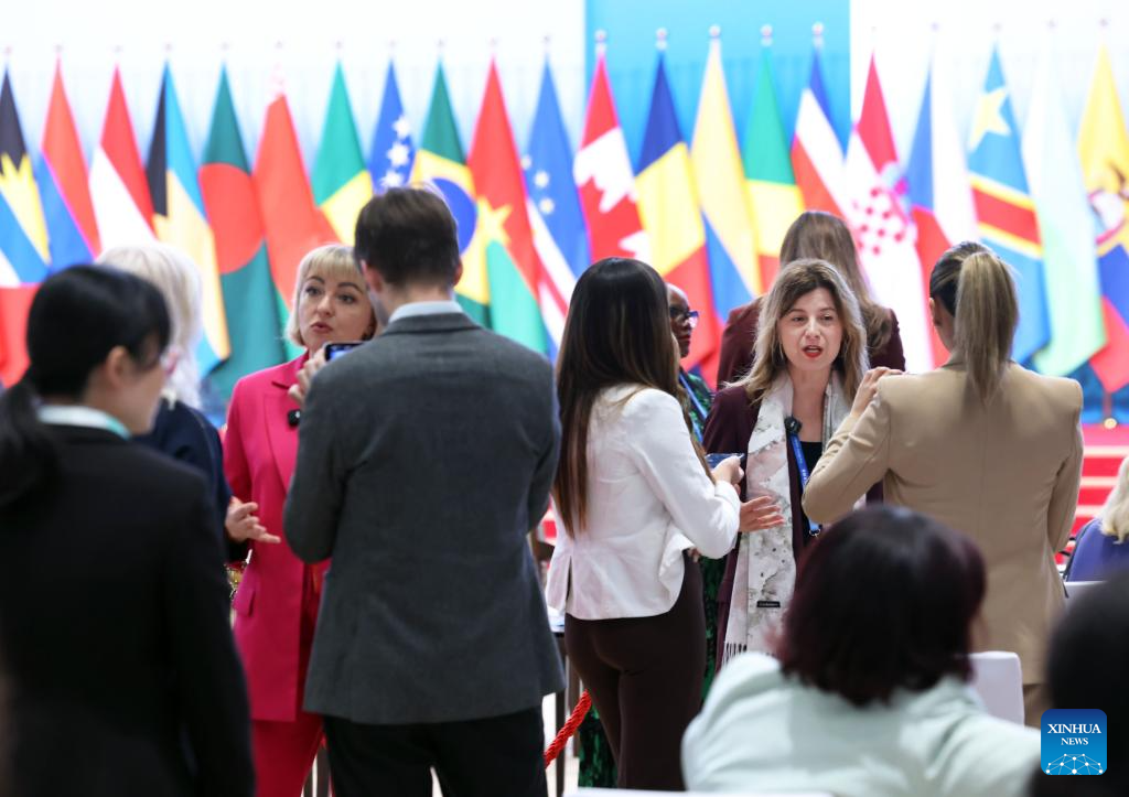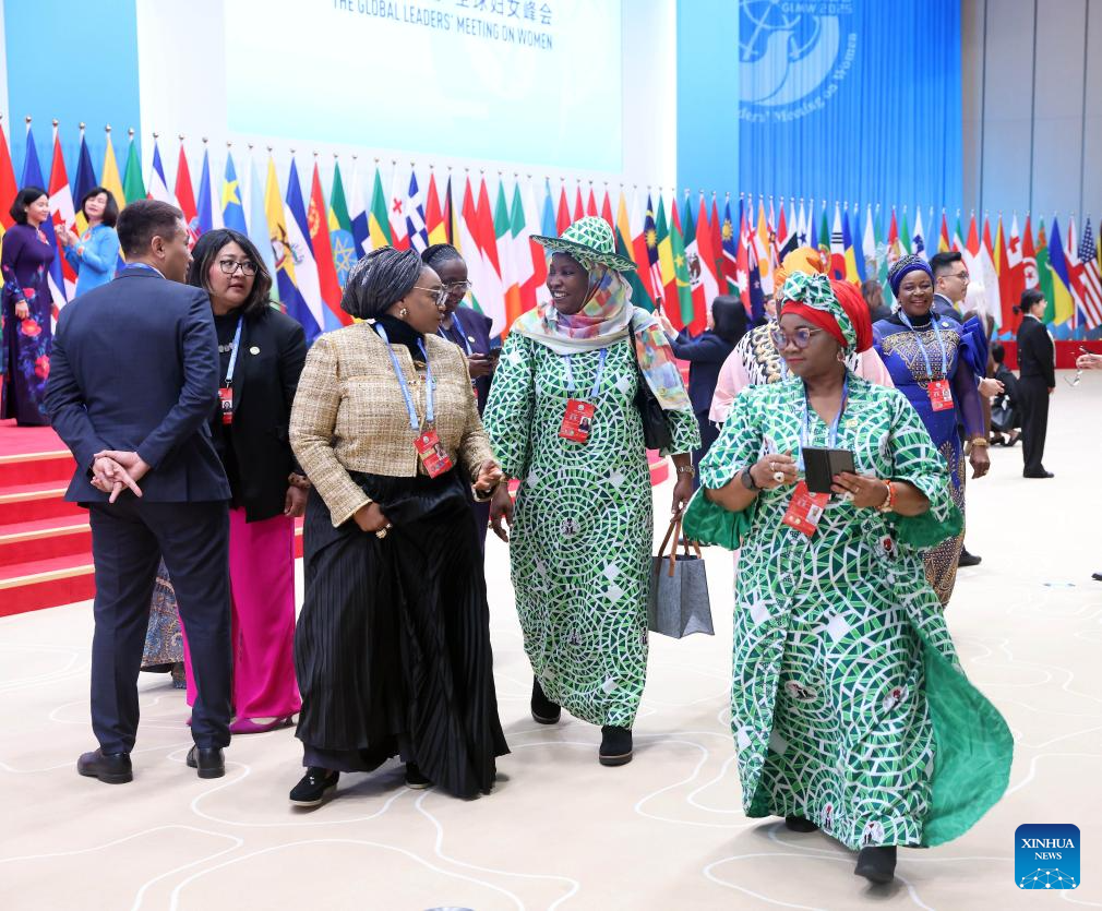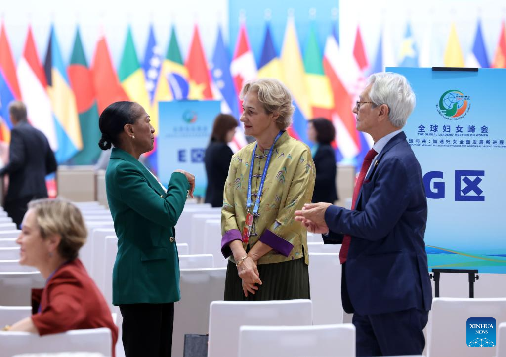 Participants communicate while attending the Global Leaders' Meeting on Women in Beijing, capital of China, Oct. 13, 2025. The Global Leaders' Meeting on Women was held in Beijing on Monday. (Xinhua/Liu Weibing)