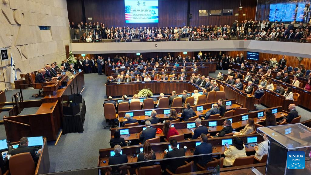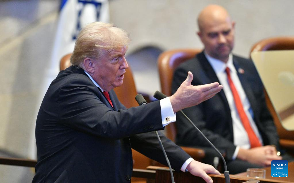 JERUSALEM, Oct. 13 (Xinhua) -- U.S. President Donald Trump addressed the Israeli parliament, the Knesset, on Monday during a brief visit as the Israel-Hamas ceasefire entered its fourth day, hailing an "end" to Israel's two-year war in Gaza.