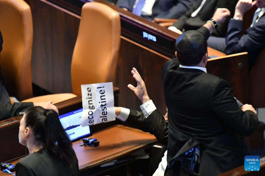 An Israeli Knesset member displays a sign calling for the recognition of Palestine during Trump's speech in Israeli parliament, the Knesset, in Jerusalem on Oct. 13, 2025. U.S. President Donald Trump addressed the Israeli parliament, the Knesset, on Monday during a brief visit as the Israel-Hamas ceasefire entered its fourth day, hailing an "end" to Israel's two-year war in Gaza. Trump's speech was briefly interrupted when a Knesset member displayed a sign calling for the recognition of Palestine. (JINI via Xinhua)
