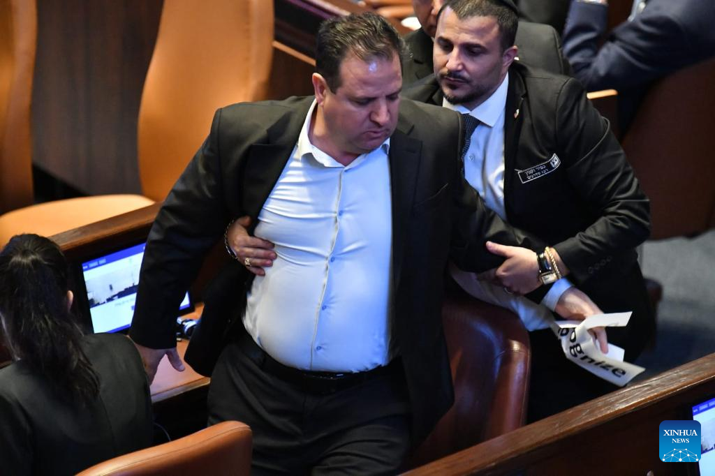 An Israeli Knesset member is taken away by security after displaying a sign calling for the recognition of Palestine during Trump's speech in Israeli parliament, the Knesset, in Jerusalem on Oct. 13, 2025. U.S. President Donald Trump addressed the Israeli parliament, the Knesset, on Monday during a brief visit as the Israel-Hamas ceasefire entered its fourth day, hailing an "end" to Israel's two-year war in Gaza. Trump's speech was briefly interrupted when a Knesset member displayed a sign calling for the recognition of Palestine. (JINI via Xinhua)