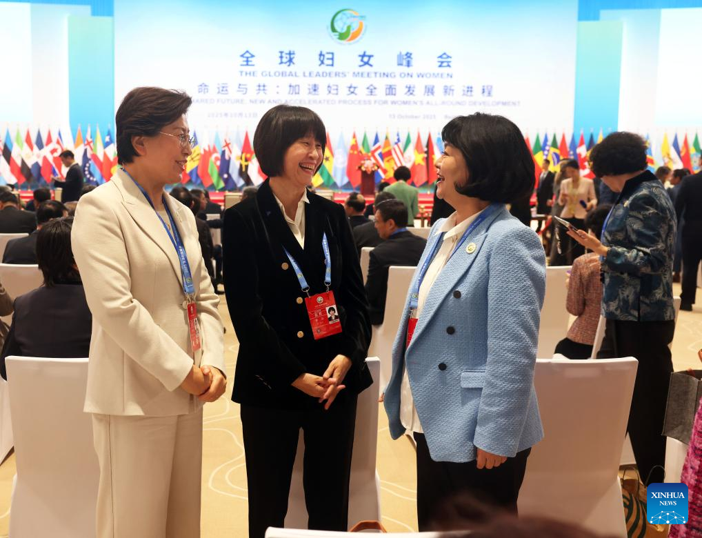 Participants communicate while attending the Global Leaders' Meeting on Women in Beijing, capital of China, Oct. 13, 2025.