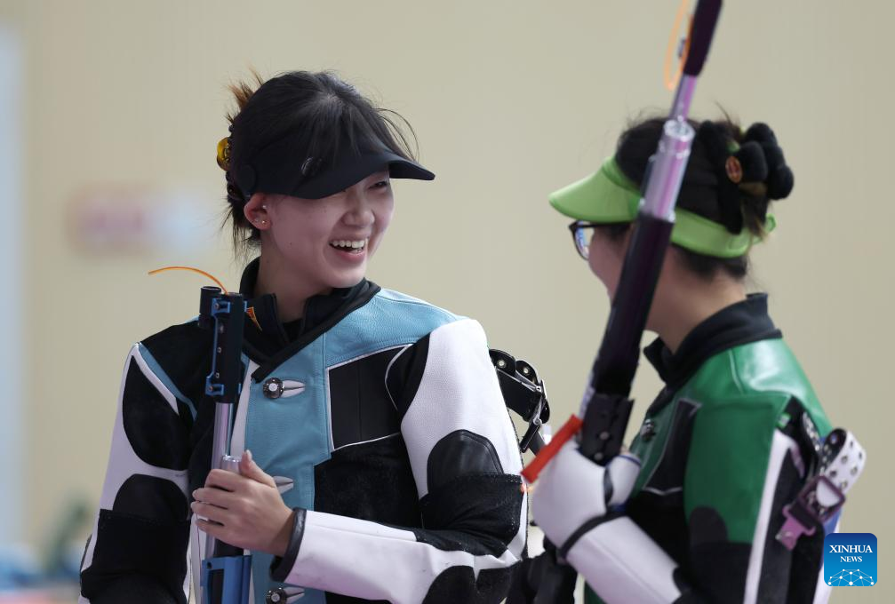 Silver medalist Yan Jinjing (L) of Jiangsu talks with gold medalist Han Jiayu of Zhejiang after the 10m air rifle women's final of shooting at China's 15th National Games in Guangzhou, south China's Guangdong Province, Oct. 13, 2025. (Xinhua/Lu Hanxin)