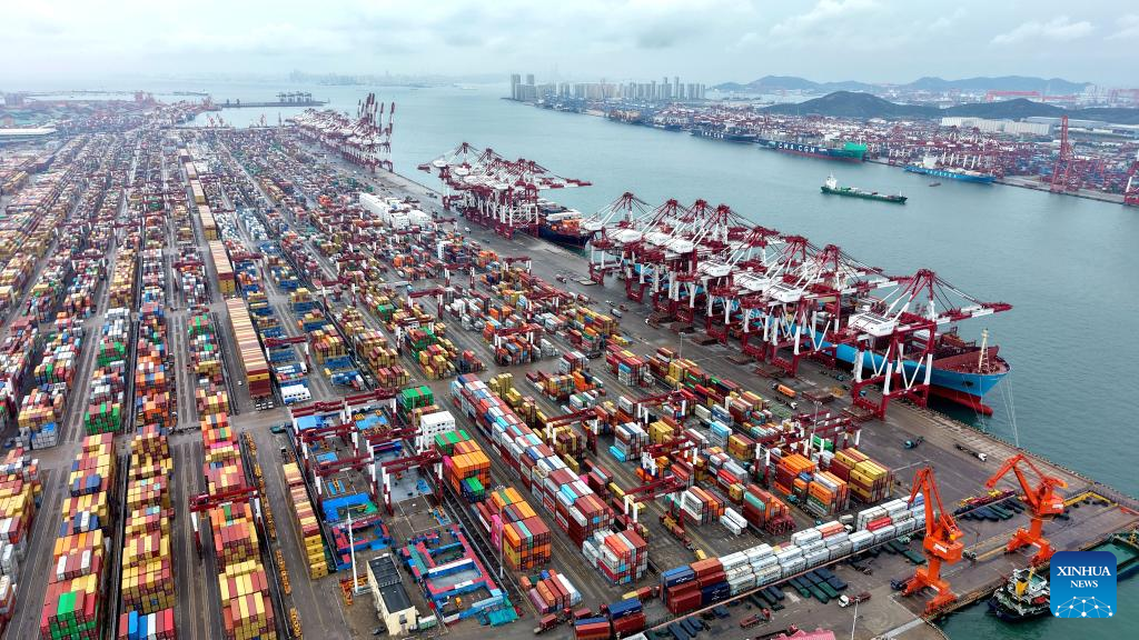 An aerial drone photo taken on Oct. 13, 2025 shows a view of the container terminal for foreign trade at Qingdao Port in Qingdao, east China's Shandong Province.