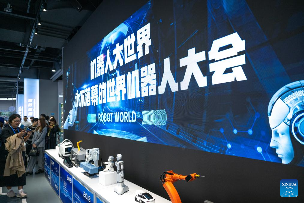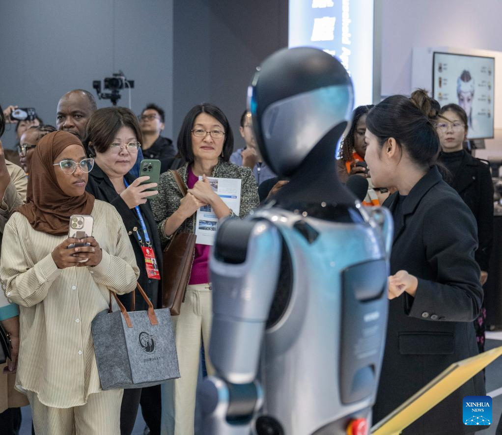Representatives, who are in Beijing for the Global Leaders' Meeting on Women, learn about a humanoid robot at the Beijing World of Robots in Beijing, capital of China, Oct. 14, 2025. (Xinhua/Du Zixuan)