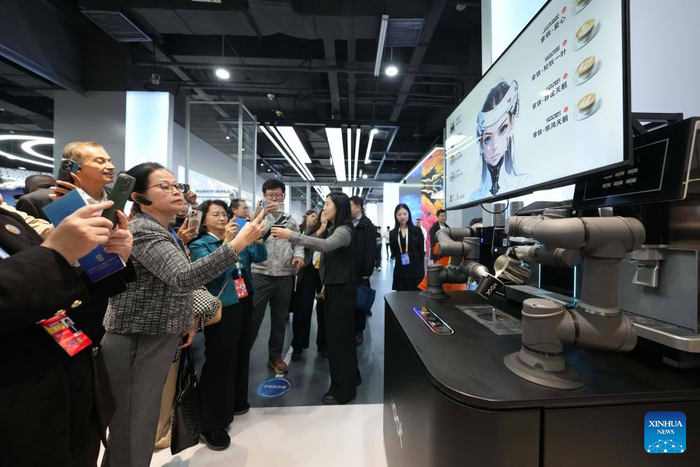 Representatives, who are in Beijing for the Global Leaders' Meeting on Women, watch a robot brewing coffee at the Beijing World of Robots in Beijing, capital of China, Oct. 14, 2025. (Xinhua/Du Zixuan)