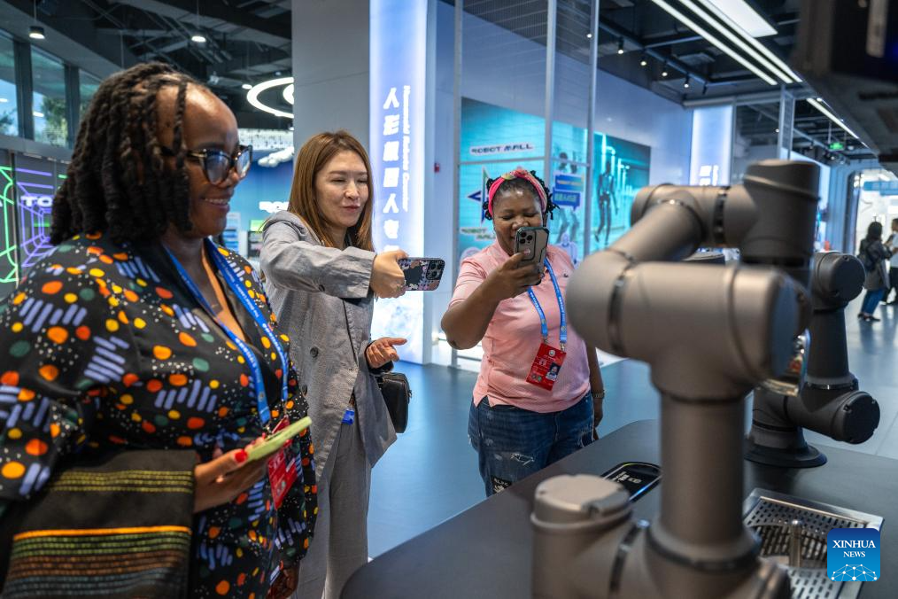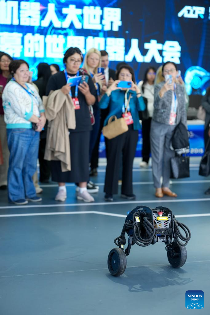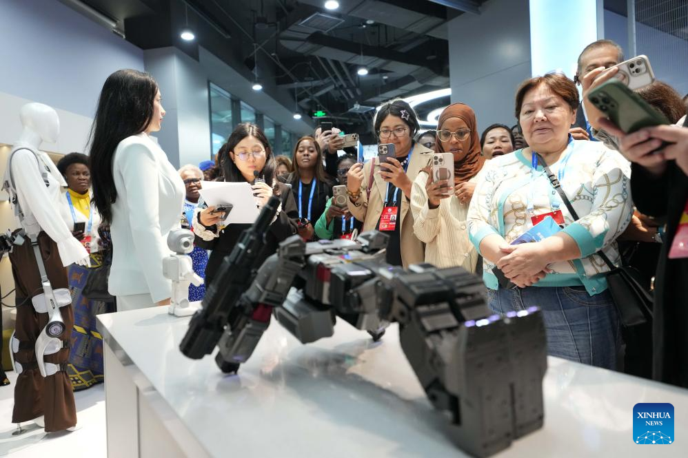 Representatives, who are in Beijing for the Global Leaders' Meeting on Women, watch the demonstration of a robot at the Beijing World of Robots in Beijing, capital of China, Oct. 14, 2025. (Xinhua/Xue Yuge)