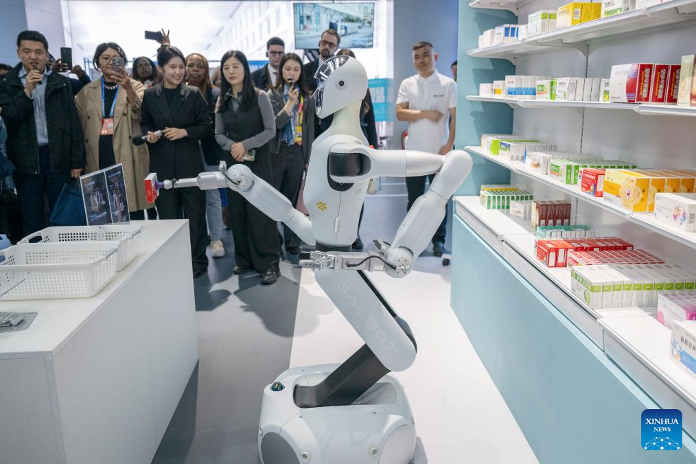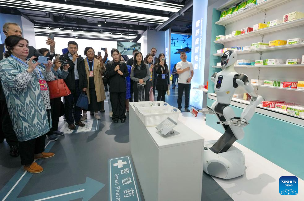Representatives, who are in Beijing for the Global Leaders' Meeting on Women, watch a robot fetching medicine at the Beijing World of Robots in Beijing, capital of China, Oct. 14, 2025. (Xinhua/Xue Yuge)