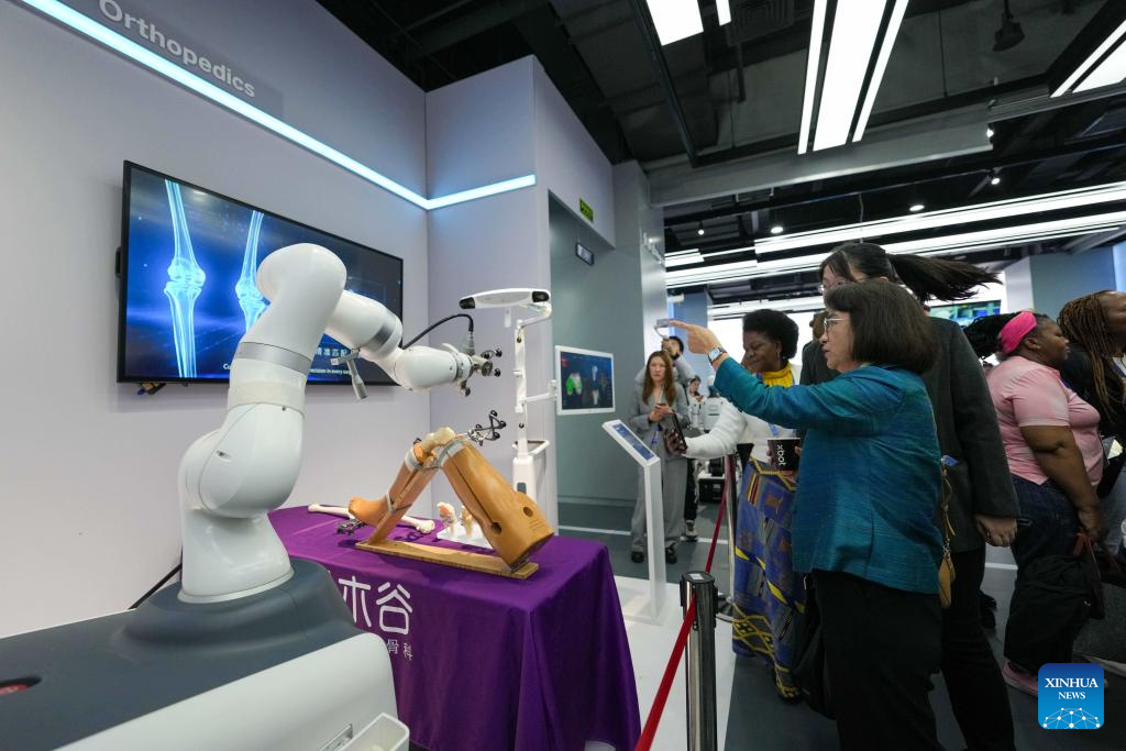 Representatives, who are in Beijing for the Global Leaders' Meeting on Women, learn about an AI-powered orthopedic robot at the Beijing World of Robots in Beijing, capital of China, Oct. 14, 2025. (Xinhua/Xue Yuge)