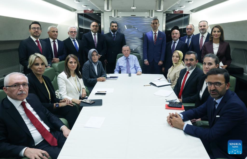 Turkish President Recep Tayyip Erdogan poses for a group photo with journalists on his return flight from Egypt on Oct. 14, 2025. Turkish President Recep Tayyip Erdogan on Tuesday said the ceasefire agreement reached in Egypt's Sharm el-Sheikh should not be mistaken for a final settlement to the Palestinian issue, while urging Israel to honor its commitments and warning against possible violations. (Turkish presidency/Handout via Xinhua)