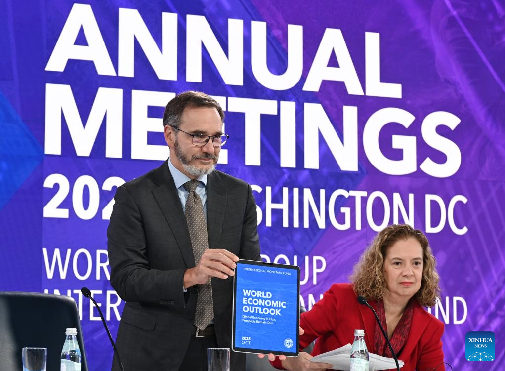 The International Monetary Fund (IMF) chief economist Pierre-Olivier Gourinchas (L) presents the latest World Economic Outlook at a press briefing of in Washington, D.C., the United States, Oct. 14, 2025. IMF on Tuesday raised its global economic growth for 2025 to 3.2 percent, 0.2 percentage point higher than the July forecast, the latest World Economic Outlook report said. (Xinhua/Li Rui)