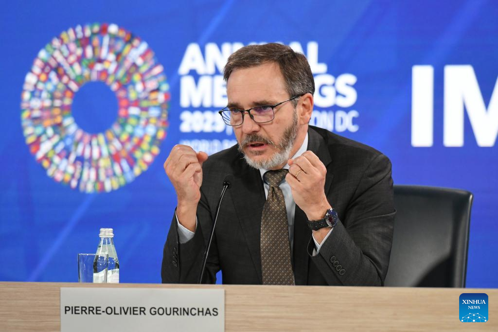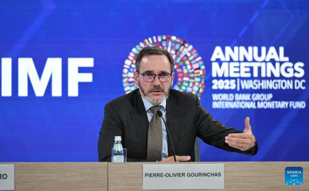 The International Monetary Fund (IMF) chief economist Pierre-Olivier Gourinchas speaks at a press briefing on World Economic Outlook in Washington, D.C., the United States, Oct. 14, 2025. IMF on Tuesday raised its global economic growth for 2025 to 3.2 percent, 0.2 percentage point higher than the July forecast, the latest World Economic Outlook report said. (Xinhua/Li Rui)