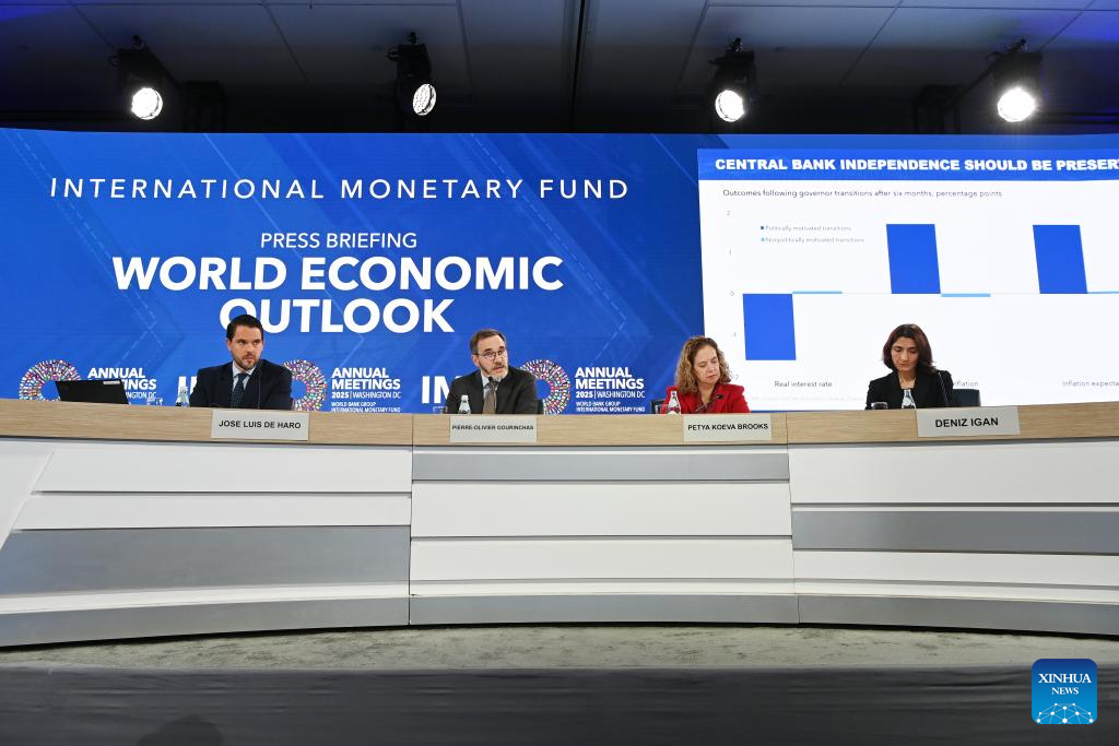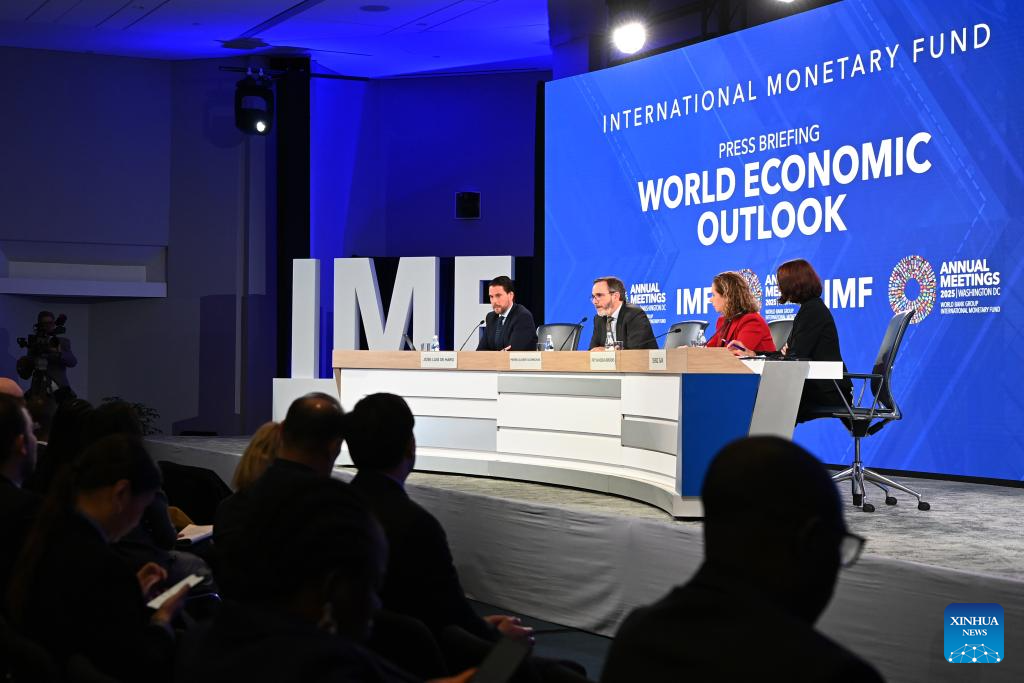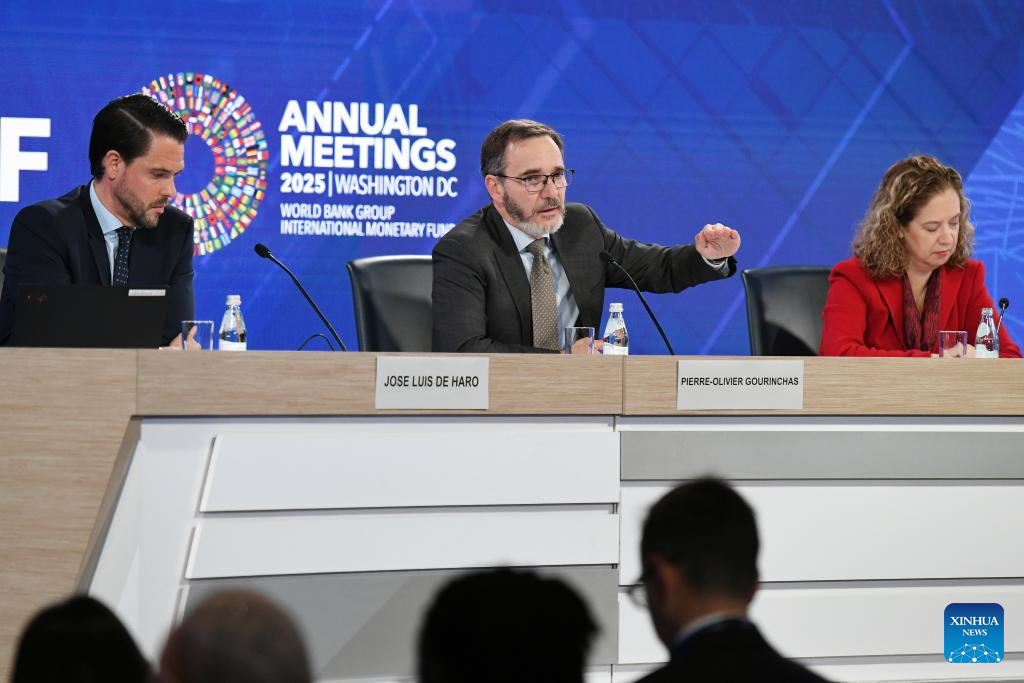 The International Monetary Fund (IMF) chief economist Pierre-Olivier Gourinchas (2nd L) speaks at a press briefing on World Economic Outlook in Washington, D.C., the United States, Oct. 14, 2025. IMF on Tuesday raised its global economic growth for 2025 to 3.2 percent, 0.2 percentage point higher than the July forecast, the latest World Economic Outlook report said. (Xinhua/Li Rui)