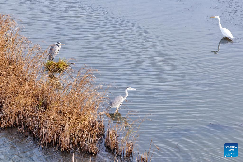 This photo taken on Oct. 14, 2025 shows herons and egrets in Sanjiangkou national wetland park in Tongjiang City, northeast China's Heilongjiang Province. Migratory birds are about to fly south in the migratory season in Heilongjiang Province. (Photo by Liu Wanping/Xinhua)