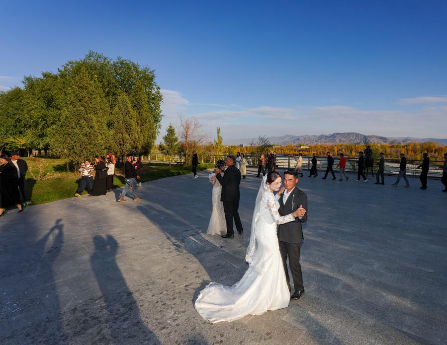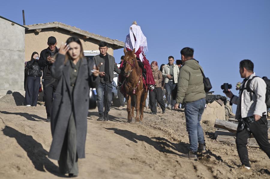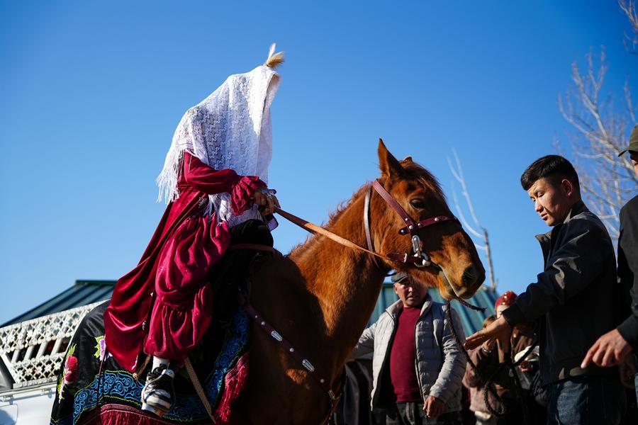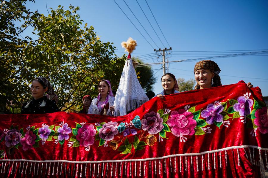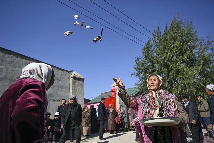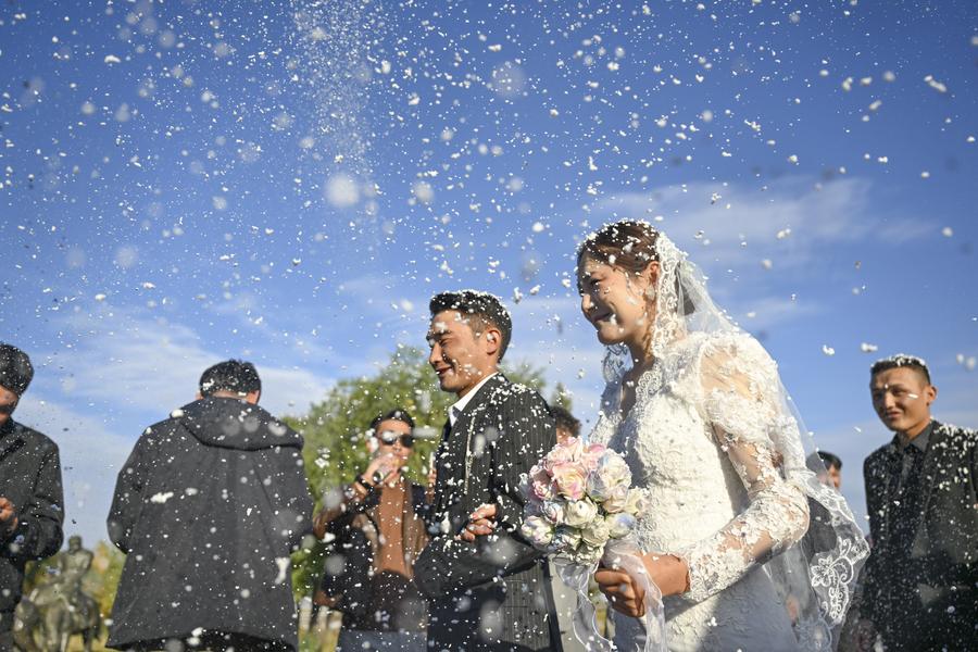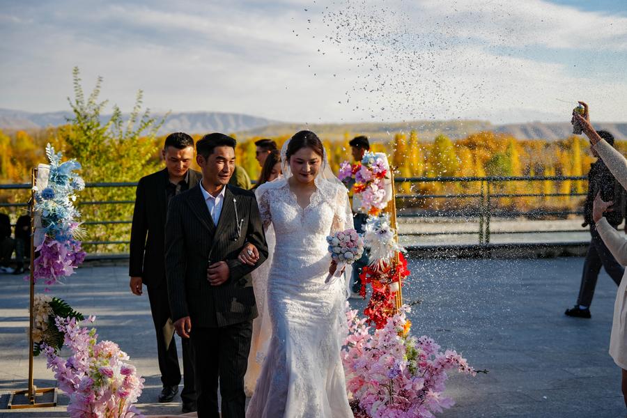 Relatives of the groom Bukehan Yelszi are treated at the bride's home in Karadala Township of Tekes County, northwest China's Xinjiang Uygur Autonomous Region, Oct. 10, 2025. (Xinhua/Hu Huhu)Kumusi Yesdawulti, the bride, rides a horse heading to a wedding procession in Karadala Township of Tekes County, northwest China's Xinjiang Uygur Autonomous Region, Oct. 11, 2025. (Xinhua/Hu Huhu)Kumusi Yesdawulti, the bride, rides a horse before leaving her home in Karadala Township of Tekes County, northwest China's Xinjiang Uygur Autonomous Region, Oct. 11, 2025. (Xinhua/Xu Hongyan)Villagers welcome Kumusi Yesdawulti, the bride in a wedding procession, at the groom Bukehan Yelszi's home in Karadala Township of Tekes County, northwest China's Xinjiang Uygur Autonomous Region, Oct. 11, 2025. (Xinhua/Hu Huhu)Kumusi Yesdawulti, the bride, heads to the groom's home in a wedding procession in Karadala Township of Tekes County, northwest China's Xinjiang Uygur Autonomous Region, Oct. 11, 2025. (Xinhua/Xu Hongyan)A villager plays the ethnic musical instrument dombra beside the bride Kumusi Yesdawulti (R) in Karadala Township of Tekes County, northwest China's Xinjiang Uygur Autonomous Region, Oct. 11, 2025. (Xinhua/Hu Huhu)The newlyweds Kumusi Yesdawulti (R) and Bukehan Yelszi attend an outdoor wedding at a forest park in Tekes County, northwest China's Xinjiang Uygur Autonomous Region, Oct. 11, 2025. (Xinhua/Xu Hongyan)The newlyweds Kumusi Yesdawulti (R) and Bukehan Yelszi walk hand in hand during an outdoor wedding at a forest park in Tekes County, northwest China's Xinjiang Uygur Autonomous Region, Oct. 11, 2025. (Xinhua/Hu Huhu)The newlyweds Kumusi Yesdawulti (R) and Bukehan Yelszi prepare champagne at a forest park in Tekes County, northwest China's Xinjiang Uygur Autonomous Region, Oct. 11, 2025. (Xinhua/Hu Huhu)The newlyweds Kumusi Yesdawulti (L) and Bukehan Yelszi dance at a forest park in Tekes County, northwest China's Xinjiang Uygur Autonomous Region, Oct. 11, 2025. (Xinhua/Xu Hongyan)The newlyweds Kumusi Yesdawulti (R) and Bukehan Yelszi have wine during an outdoor wedding at a forest park in Tekes County, northwest China's Xinjiang Uygur Autonomous Region, Oct. 11, 2025. (Xinhua/Hu Huhu)■