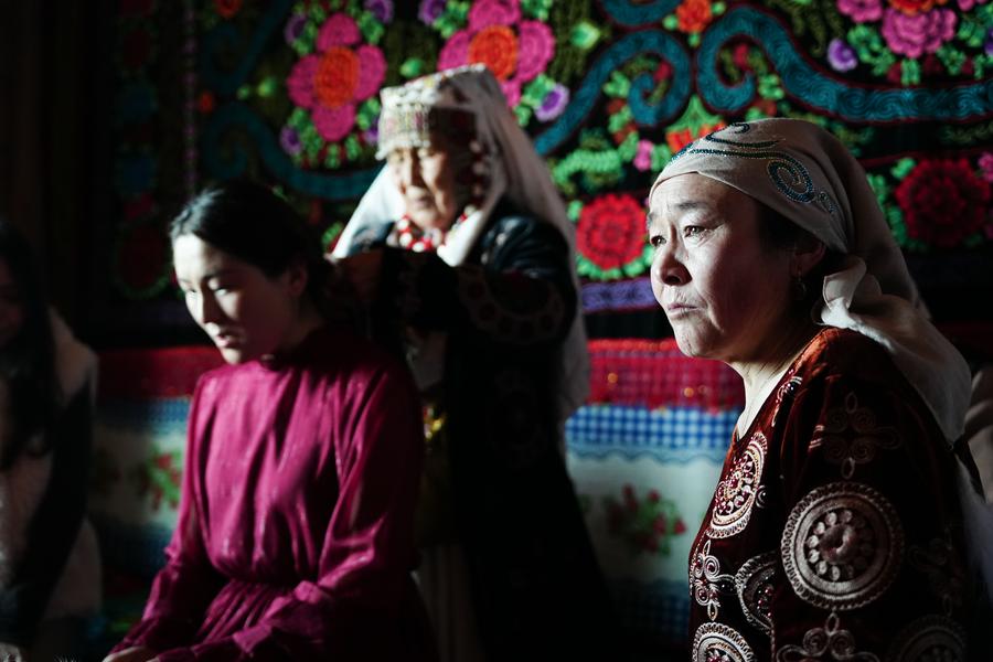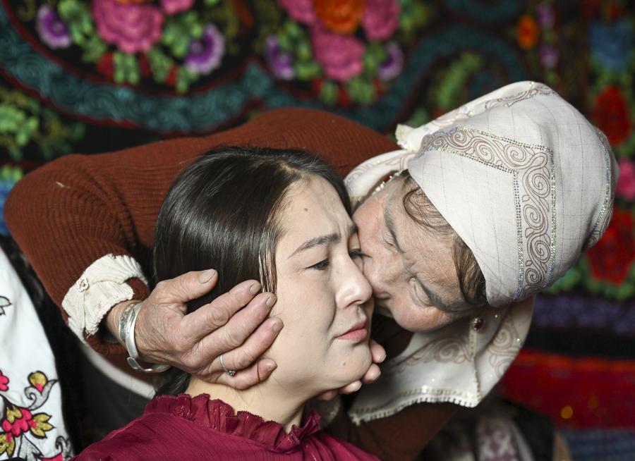 An aerial drone photo shows the home of the bride Kumusi Yesdawulti in Karadala Township of Tekes County, northwest China's Xinjiang Uygur Autonomous Region, Oct. 11, 2025. (Xinhua/Hu Huhu)Mother of the bride Kumusi Yesdawulti (1st R) sheds tears to see her daughter off in Karadala Township of Tekes County, northwest China's Xinjiang Uygur Autonomous Region, Oct. 11, 2025. (Xinhua/Xu Hongyan)A relative of the bride Kumusi Yesdawulti kisses her cheek as a see-off in Karadala Township of Tekes County, northwest China's Xinjiang Uygur Autonomous Region, Oct. 11, 2025. (Xinhua/Hu Huhu)