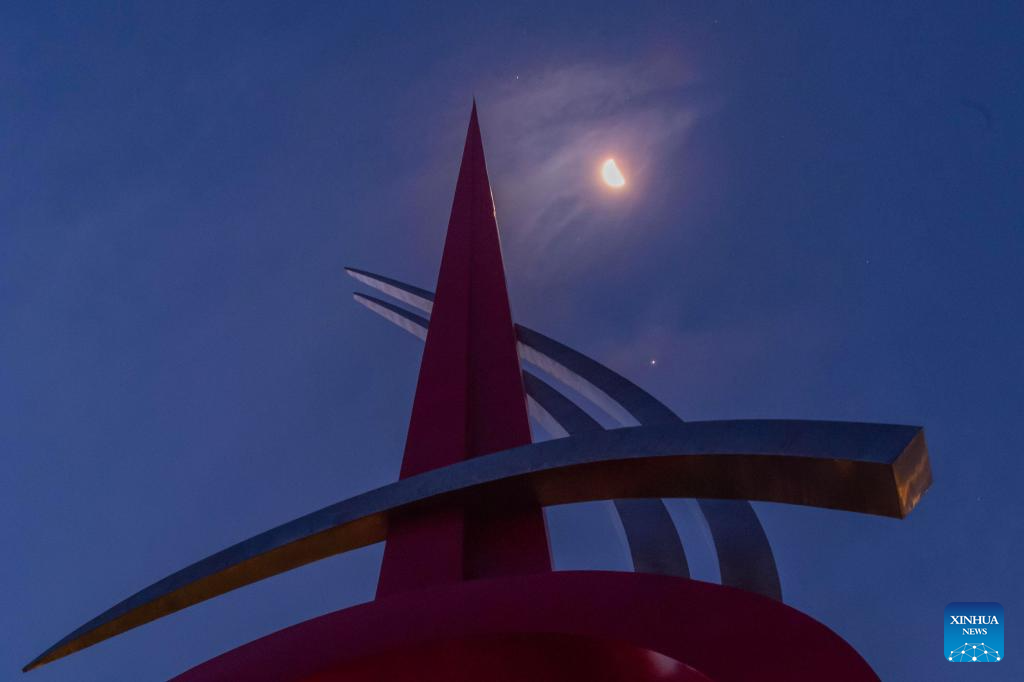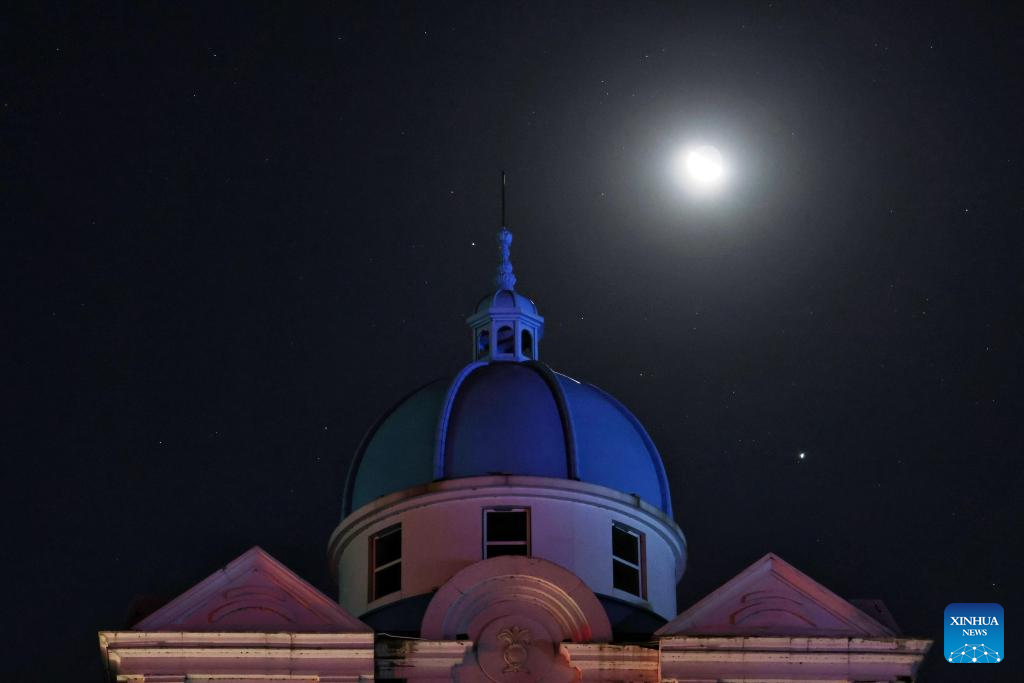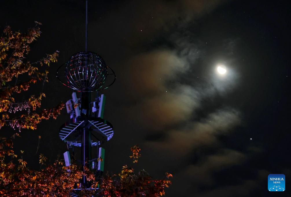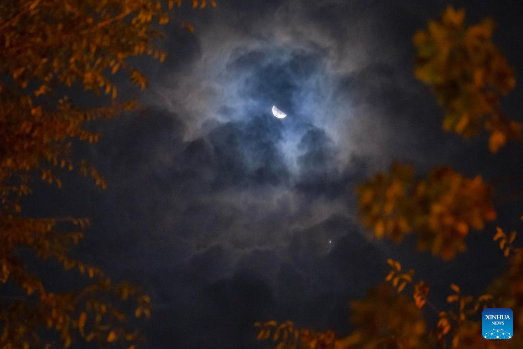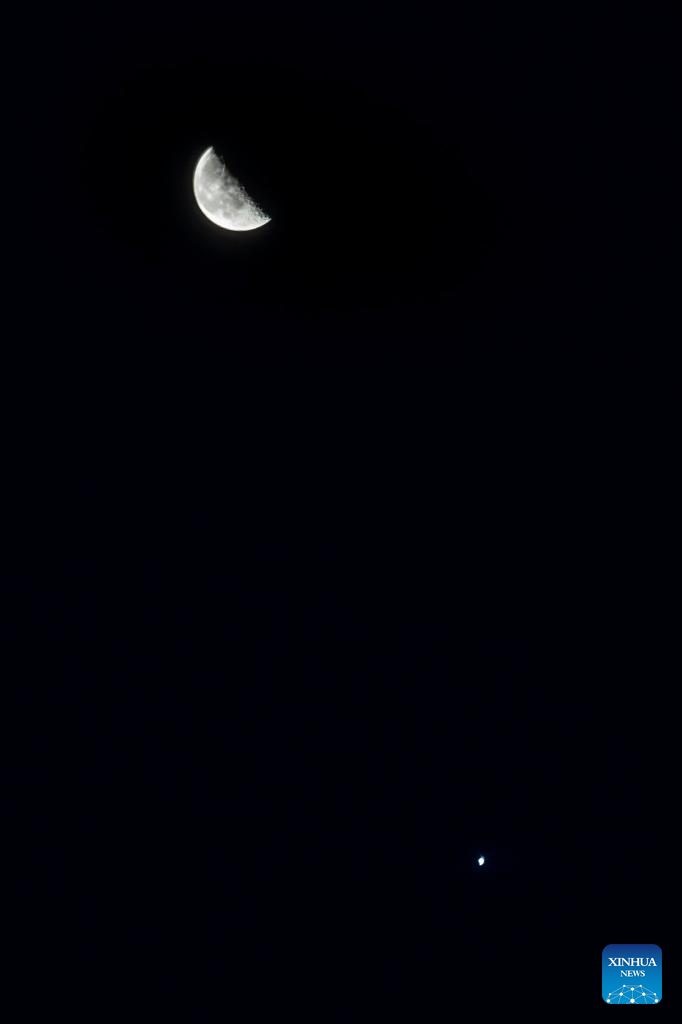 This photo taken on Oct. 14, 2025 shows the planet of Jupiter next to the moon in the sky over Qiqihar City, northeast China's Heilongjiang Province. (Photo by Wang Yonggang/Xinhua)