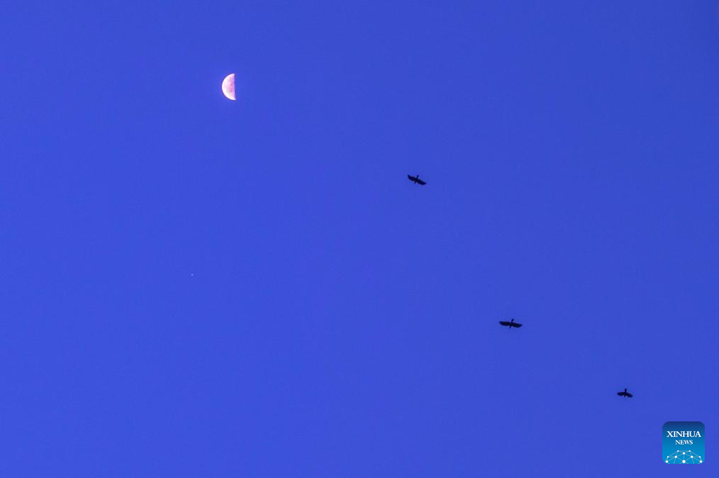 This photo taken on Oct. 14, 2025 shows the planet of Jupiter next to the moon in the sky over Tongjiang City, northeast China's Heilongjiang Province. (Photo by Liu Wanping/Xinhua)