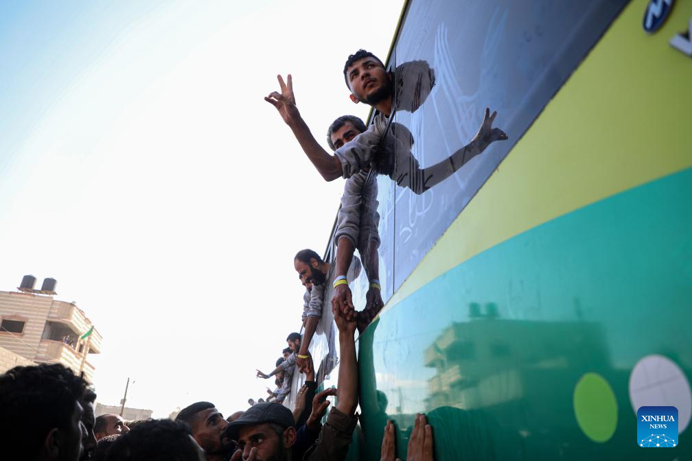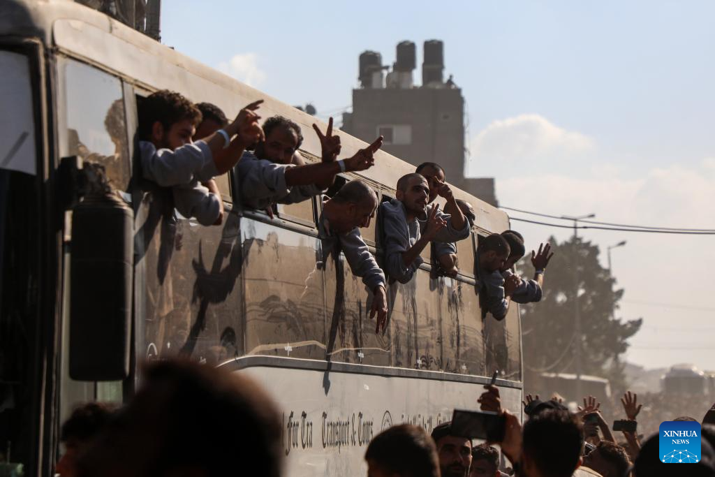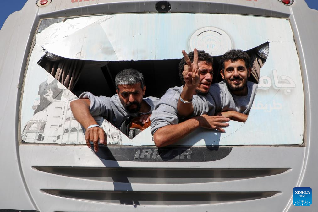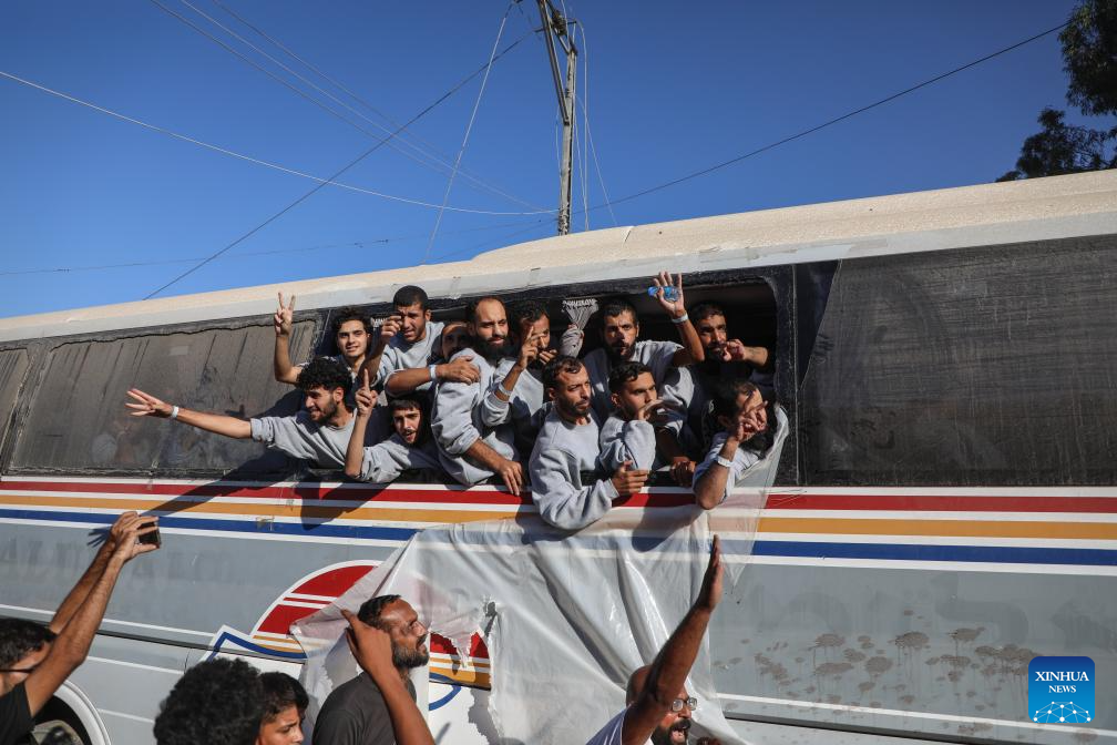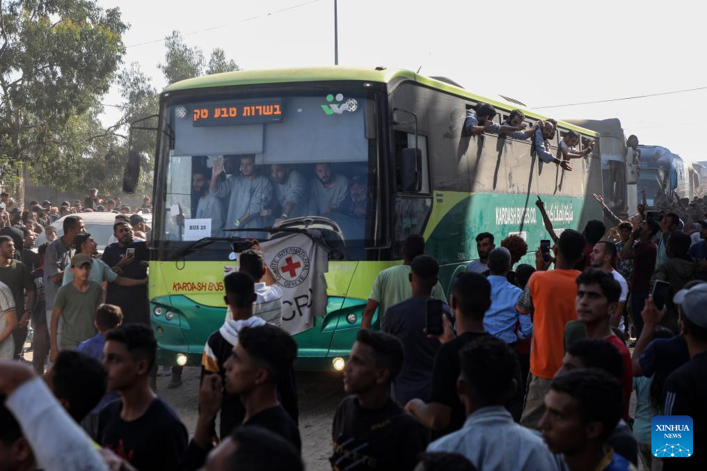 The buses operated by the International Committee of the Red Cross transported the released Palestinians into the enclave through the Kerem Shalom crossing in southeastern Gaza, as witnessed by Xinhua.