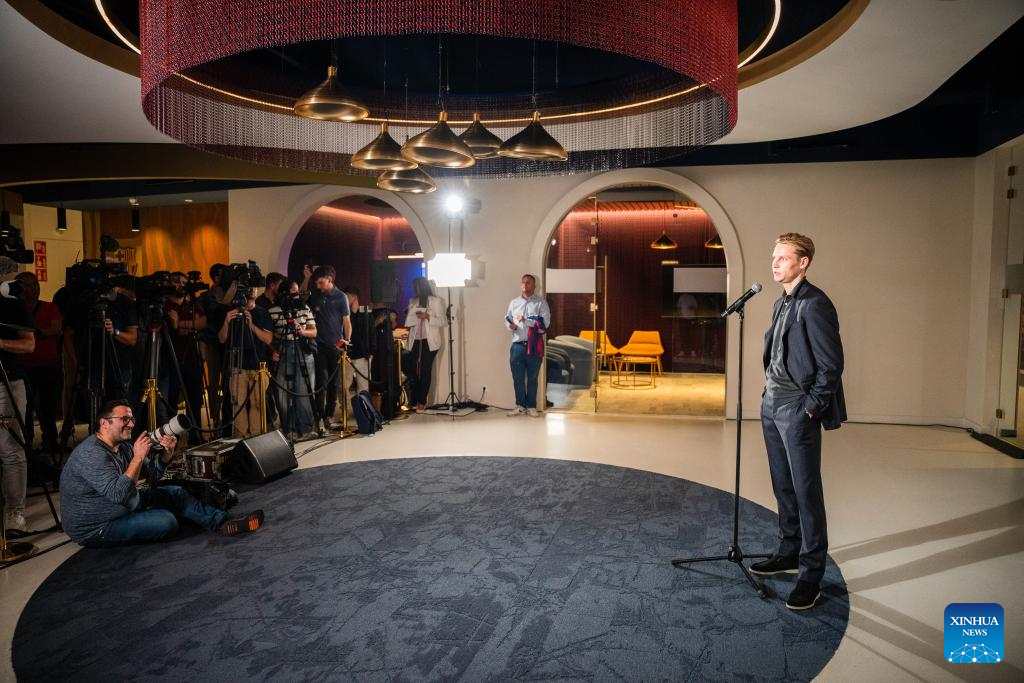 FC Barcelona Dutch midfielder Frenkie de Jong speaks to the media during a press conference in Commercial Office of FC Barcelona, Barcelona, Spain, on Oct. 15, 2025. Frenkie de Jong signed a new deal until 2029, FC Barcelona announced Wednesday. (Photo by Joan Gosa/Xinhua)