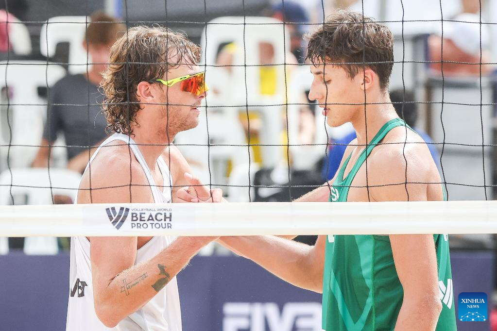 Logan Webber (L) of the United States shakes hands with Luc Fluckiger of Switzerland after the men's qualification match between Hagen Smith/Logan Webber of the United States and Florian Breer/Luc Fluckiger of Switzerland at the Volleyball World Beach Pro Tour in Laguna Province, the Philippines, Oct. 15, 2025. (Xinhua/Rouelle Umali)