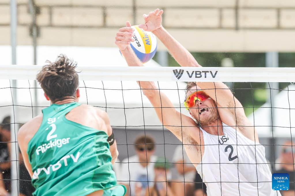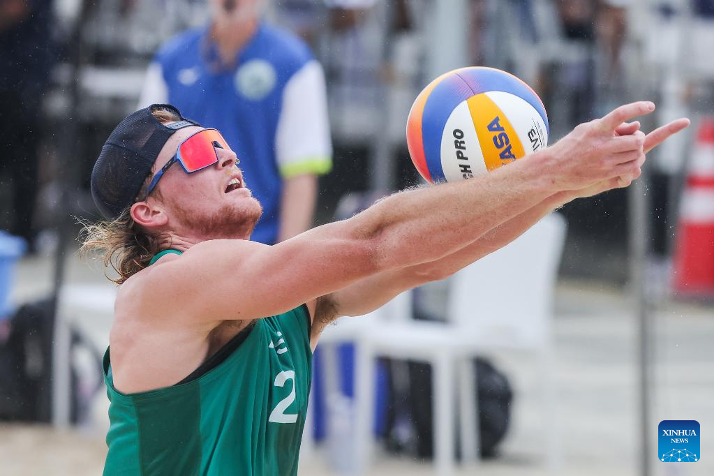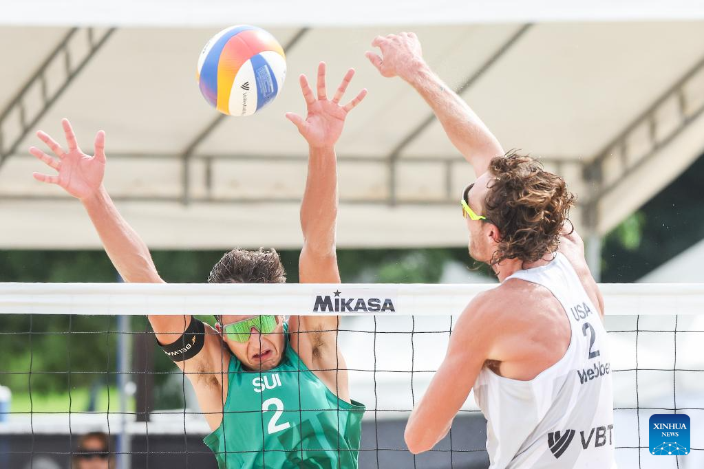 Logan Webber (R) of the United States competes against Luc Fluckiger of Switzerland during the men's qualification match between Hagen Smith/Logan Webber of the United States and Florian Breer/Luc Fluckiger of Switzerland at the Volleyball World Beach Pro Tour in Laguna Province, the Philippines, Oct. 15, 2025. (Xinhua/Rouelle Umali)