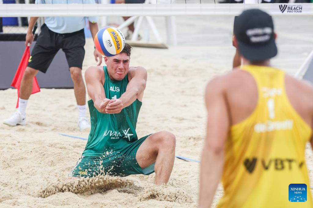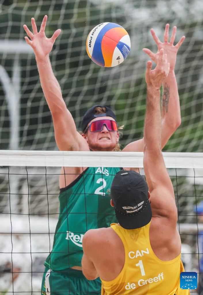 Oliver Merritt (back) of Australia competes against Luke de Greef of Canada during the men's qualification match between Ben Hood/Oliver Merritt of Australia and Luke de Greef/Martin Licht of Canada at the Volleyball World Beach Pro Tour in Laguna Province, the Philippines, Oct. 15, 2025. (Xinhua/Rouelle Umali)