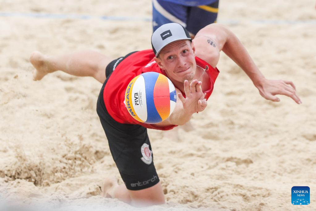 Robin Sowa of Germany competes during the men's qualification match between Jonas Reindhardt/Robin Sowa of Germany and Nathan Matos/Pablo Perez Suarez of Spain at the Volleyball World Beach Pro Tour in Laguna Province, the Philippines, Oct. 15, 2025. (Xinhua/Rouelle Umali)
