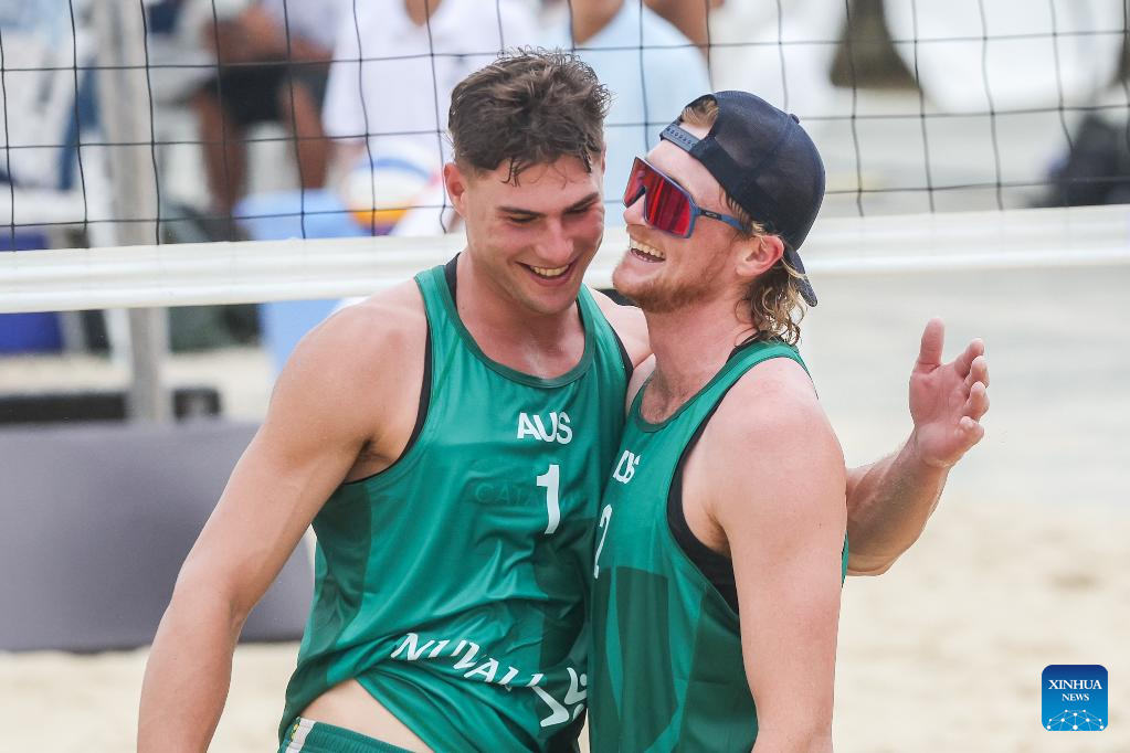 Ben Hood (L)/Oliver Merritt of Australia celebrate scoring during the men's qualification match between Ben Hood/Oliver Merritt of Australia and Luke de Greef/Martin Licht of Canada at the Volleyball World Beach Pro Tour in Laguna Province, the Philippines, Oct. 15, 2025. (Xinhua/Rouelle Umali)