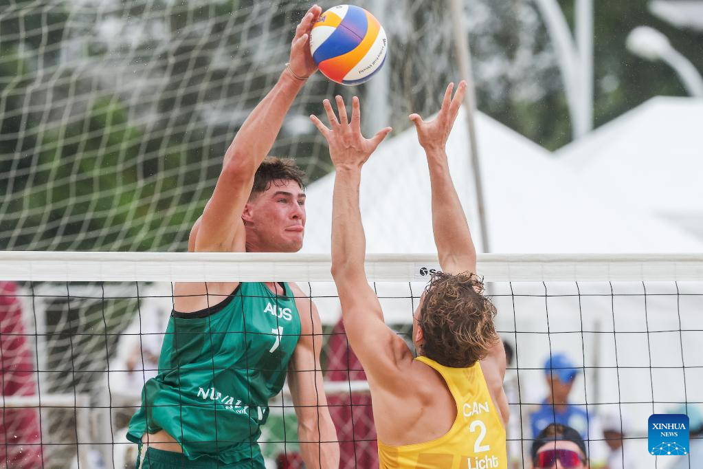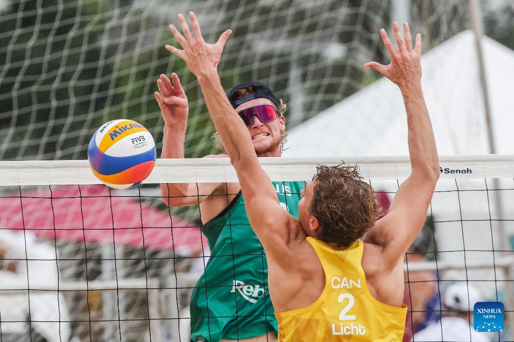 Oliver Merritt (L) of Australia spikes the ball against Martin Licht of Canada during the men's qualification match between Ben Hood/Oliver Merritt of Australia and Luke de Greef/Martin Licht of Canada at the Volleyball World Beach Pro Tour in Laguna Province, the Philippines, Oct. 15, 2025. (Xinhua/Rouelle Umali)