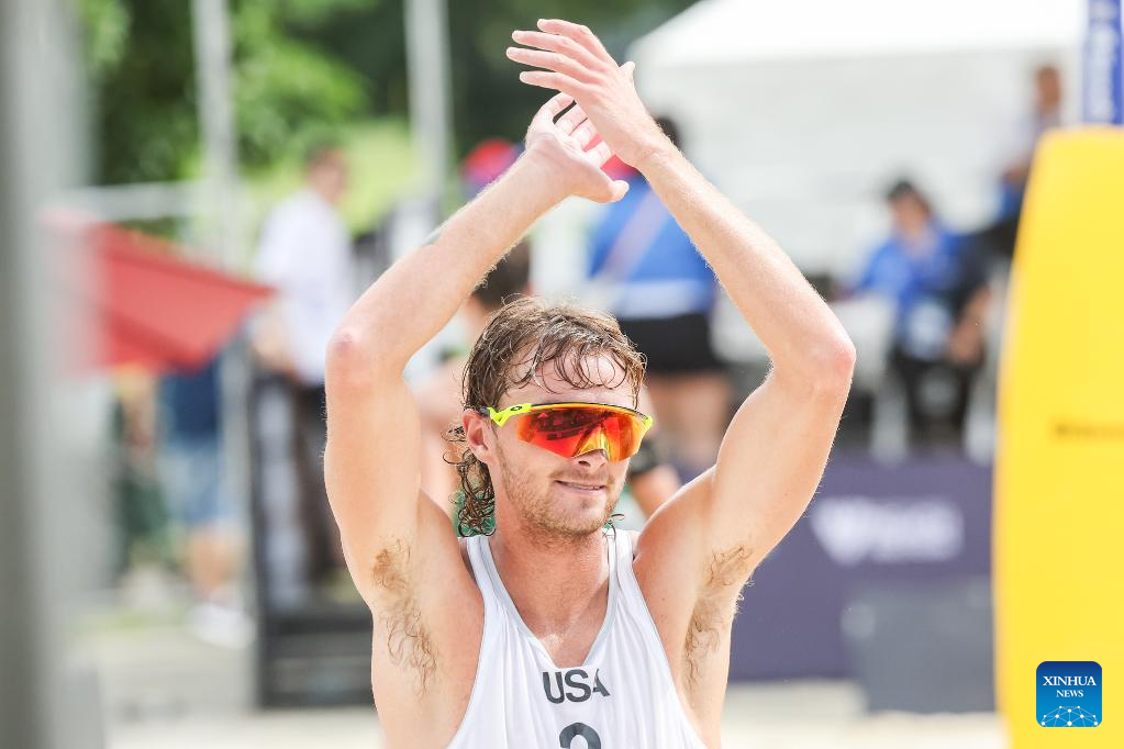 Logan Webber of the United States celebrates winning the men's qualification match between Hagen Smith/Logan Webber of the United States and Florian Breer/Luc Fluckiger of Switzerland at the Volleyball World Beach Pro Tour in Laguna Province, the Philippines, Oct. 15, 2025. (Xinhua/Rouelle Umali)