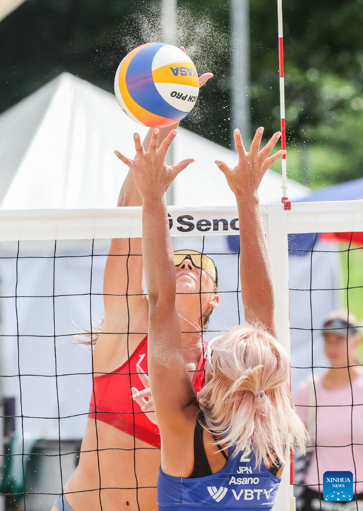 Asano Minami (L) of Japan defends Kamila Tan of the United States during the women's qualification match between Avery Poppinga/Kamila Tan of the United States and Urata Keiko/Asano Minami of Japan at the Volleyball World Beach Pro Tour in Laguna Province, the Philippines, Oct. 15, 2025. (Xinhua/Rouelle Umali)
