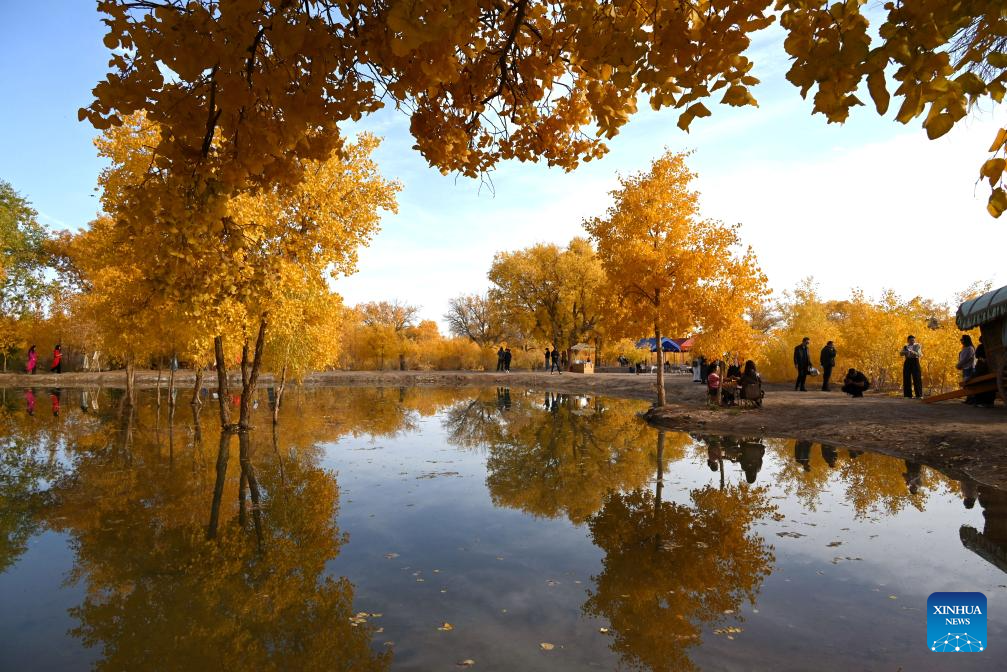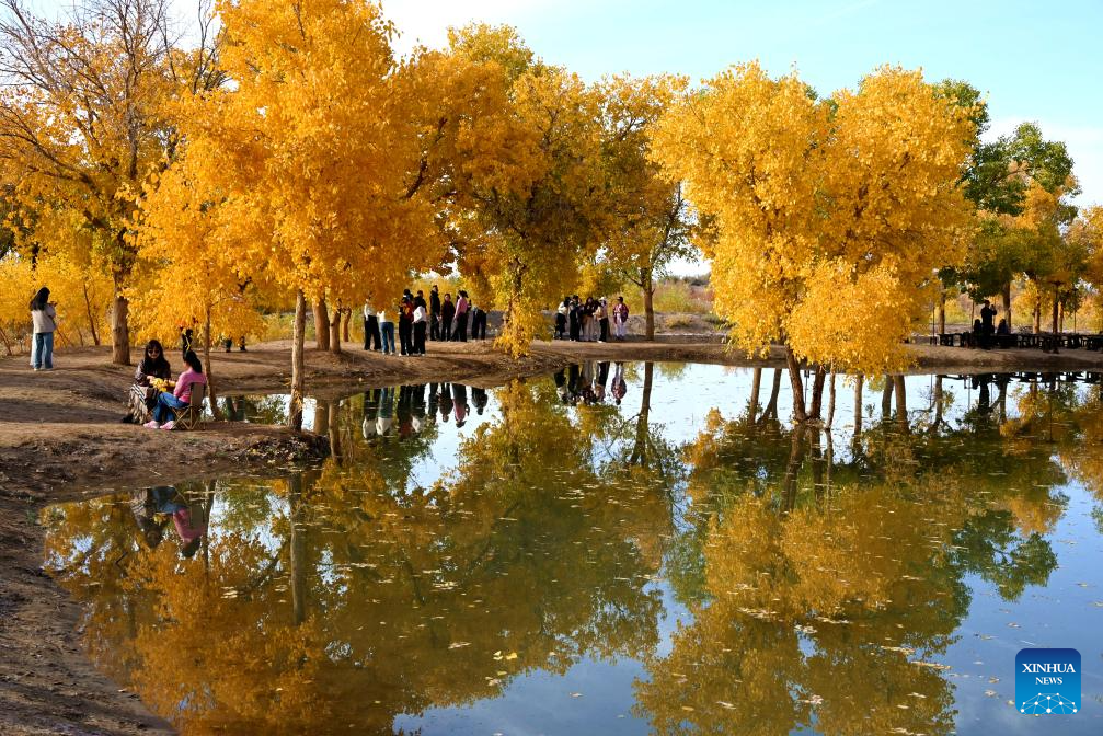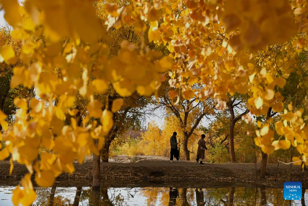 Tourists enjoy scenery in a populus euphratica forest in Dunhuang City, northwest China's Gansu Province, Oct. 14, 2025. (Photo by Zhang Xiaoliang/Xinhua)