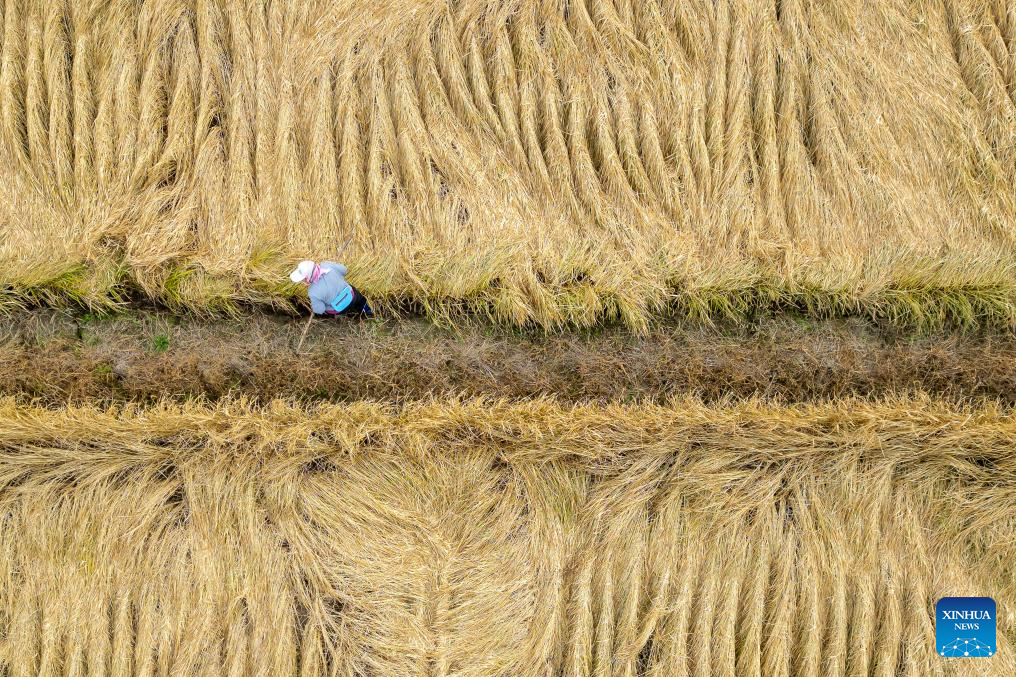 An aerial drone photo taken on Oct. 14, 2025 shows a farmer driving a reaper to harvest rice in Mudanjiang City, northeast China's Heilongjiang Province. The autumn harvest in Heilongjiang, China's top grain producer, has been in full swing. As of Oct. 14, Heilongjiang had completed the harvesting of approximately 153.60 million mu (10.24 million hectares) of autumn grain crops, accounting for over 60 percent of the total. (Xinhua/Zhang Tao)